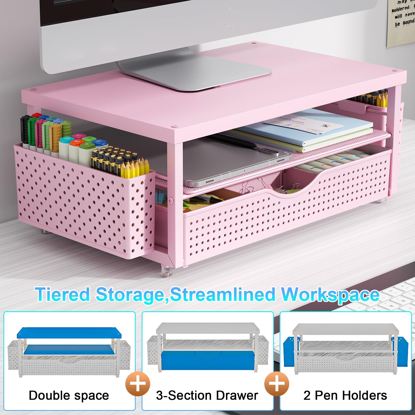【Organized Storage】This desk monitor stand/organizer features two tiers of storage for files and notes. Equipped with two pen holders and a drawer , it effortlessly organizes pens, scissors, and other desk essentials, keeping everything within reach.