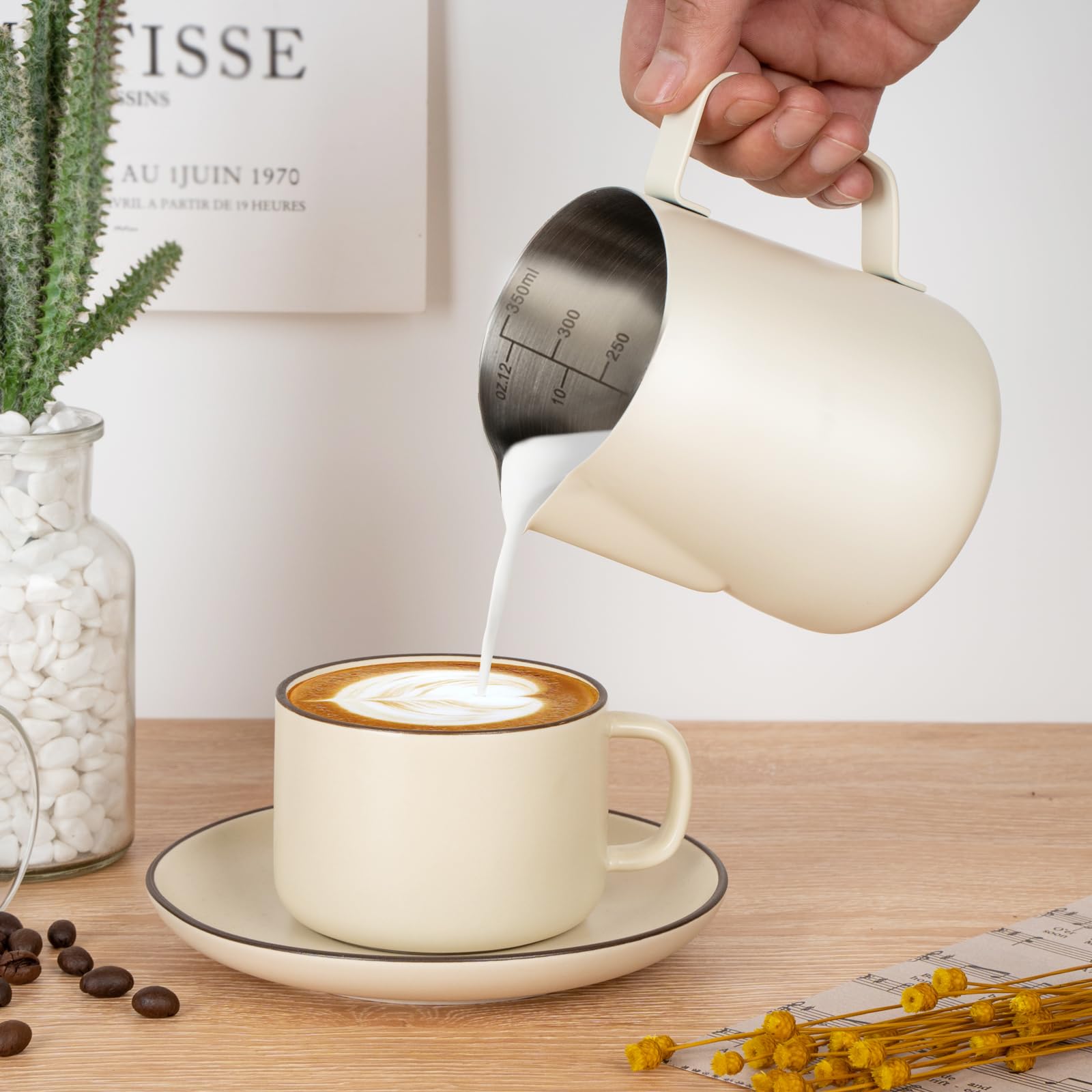 PROPER CAPACITY: The coffee frother cup has precise scale mark inside for you to control the milk needed easily. The marks are laser printed without groove. It is easy to wash and dishwasher safe without residual milk foam