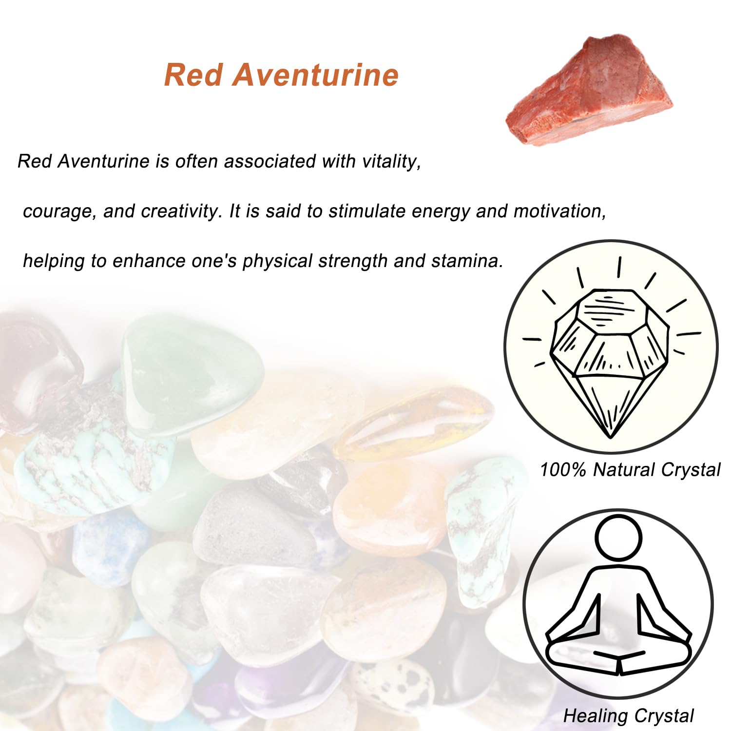 Natural: You will receive 1pcs authentic raw Red Aventurine stone. Red Aventurine is often associated with vitality, courage, and creativity. It is said to stimulate energy and motivation, helping to enhance one's physical strength and stamina.