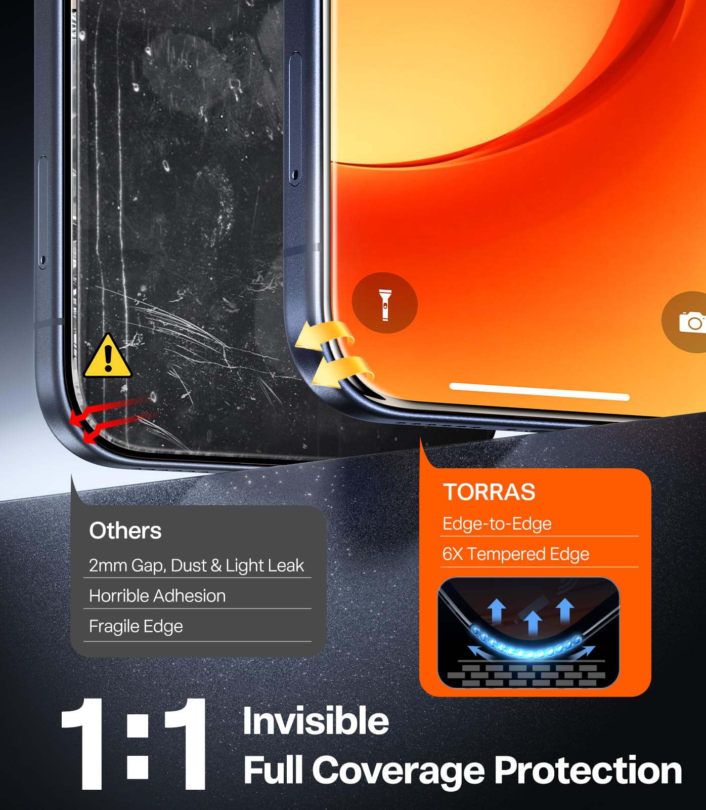 (1:1 Invisible Full Coverage Protection) Featuring a 2.5D Edge-to-Edge Design and 6X Tempered Edge, this screen protector delivers gap-free, dust-free, and light leak-free defense—offering a seamless edge-to-edge fit so precise, you’ll forget it’s even there. It’s fully compatible with any case, while its curved edges ensure a smooth, finger-friendly touch experience that feels natural with every use.