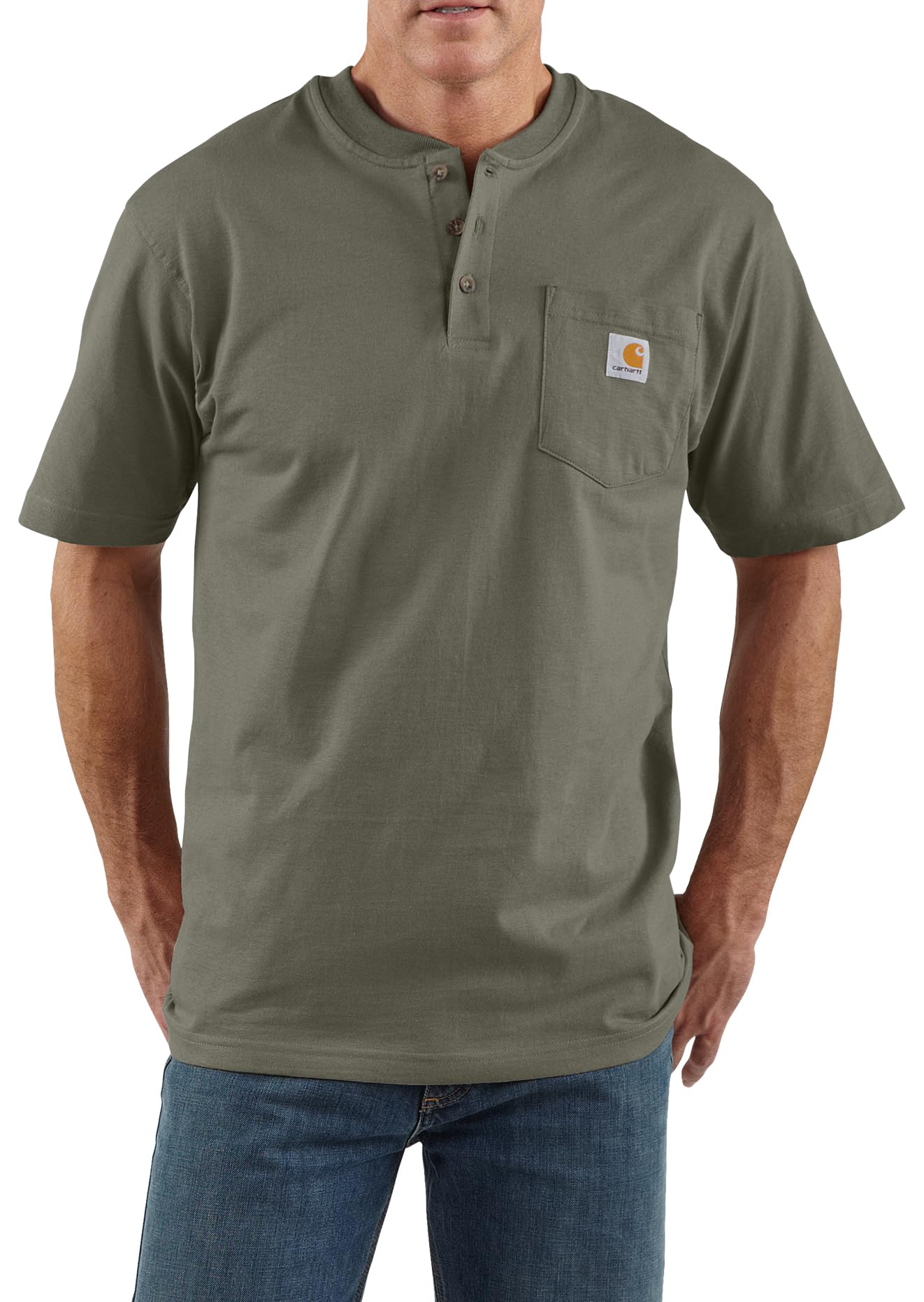 Description Carhartt's short sleeve workwear henley is an all-purpose work shirt that is perfect in warm weather or for layering when it gets cold it's made of 675-ounce 100-percent cotton jersey knit henley and features a rib-knit collar with a three-button closure and a left chest pocket it's also been designed with side-seamed construction to minimize twisting and maximize comfort