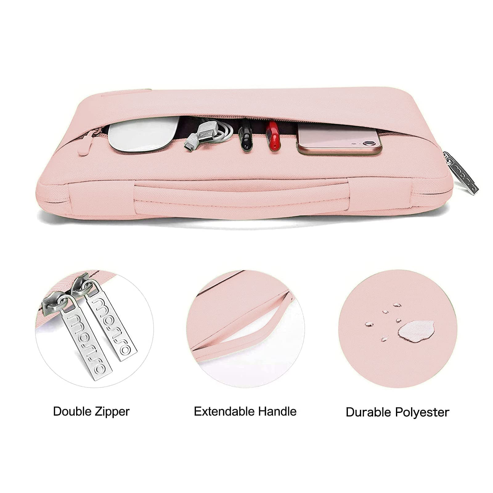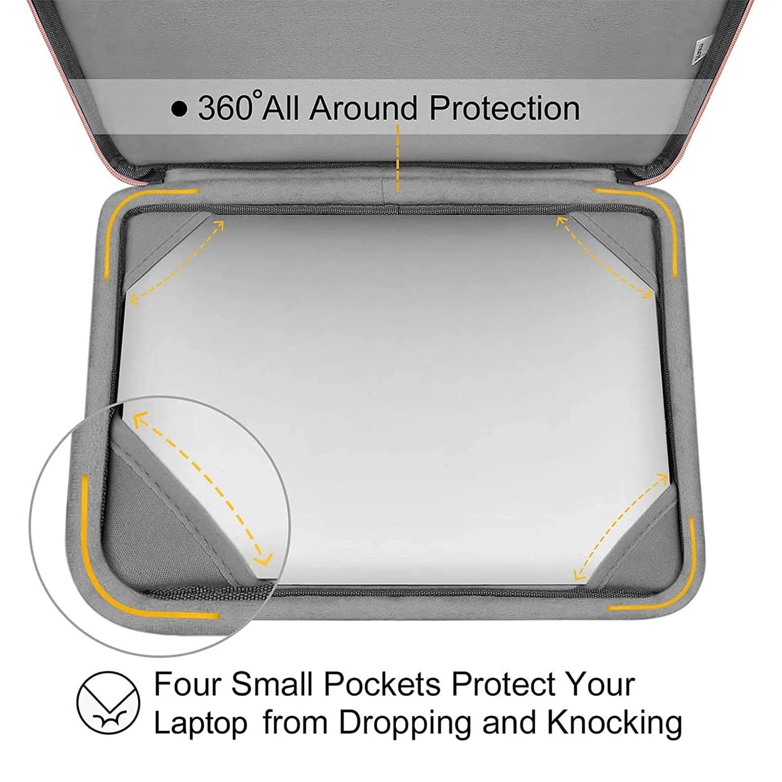 The 360 degree protective shockproof laptop sleeve with handle carrying bag internal dimension: 13.39 x 9.25 x 0.79 inches (L x W x H); external dimension: 13.98 x 9.84 x 0.79 inches (L x W x H). The front side pocket dimension: 11.61 x 9.25 inches (L x W). Made of polyester material, protect your laptop against accidental spills. Slim and lightweight, does not bulk your device up and can easily slide into your briefcase, backpack or other bag. Ideal for business, daily and travel.