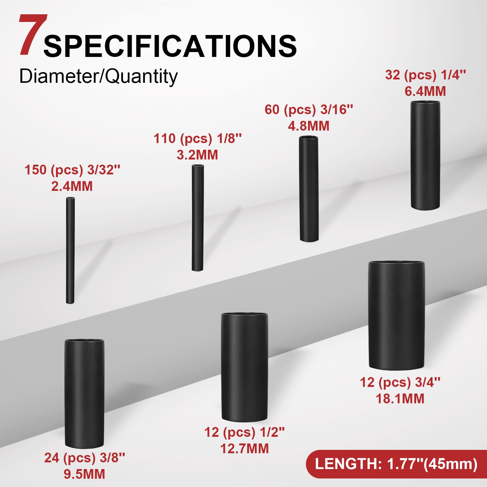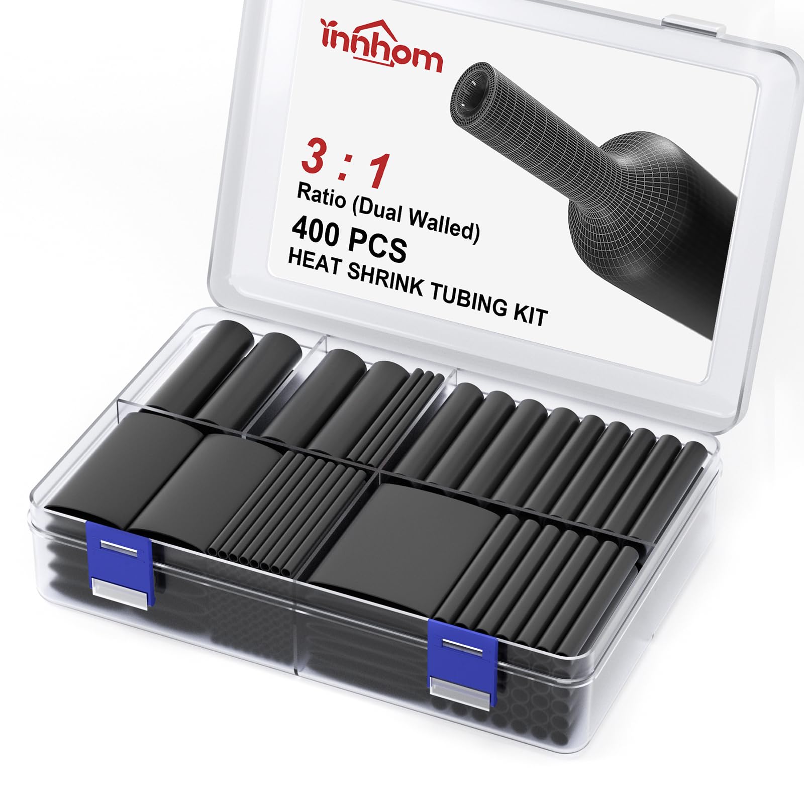 What You Get: Total 400pcs shrinkage ratio 3:1 Black heat shrink tubes, 7 sizes. Supplied internal diameter, 150 (pcs) 3/32'', 110 (pcs) 1/8'', 60 (pcs) 3/16'', 32 (pcs) 1/4'', 24 (pcs) 3/8'', 12 (pcs) 1/2", 12 (pcs) 3/4''. Single length 1.77 inches. All packed in a plastic case for easy storage. innhom wire shrink tubing can ensure your pleasant shopping experience.