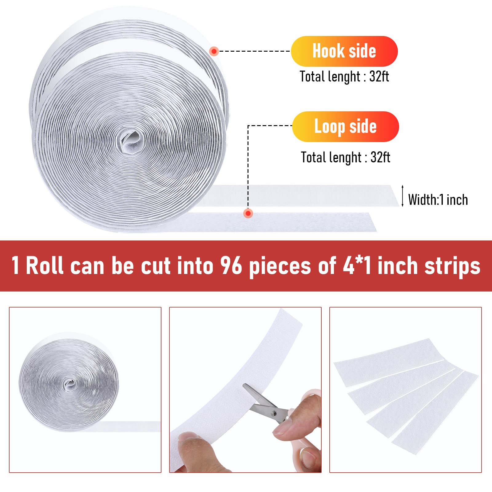 【Cut Freely】:One set contains 1 roll of hook tape and 1 roll of loop tape (1 set 32ft*1in=96 set 4in*1in). The box also comes with a pair of scissors and a retractable tape measure for easy cutting measurement.