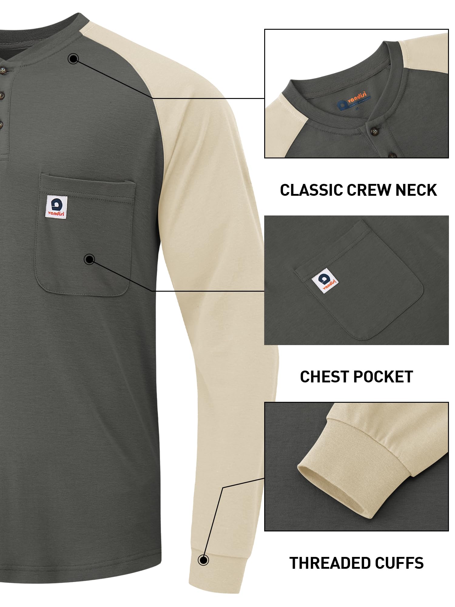 【Humanized Design】The Vandisi CAT 2 FR shirt features high-density seams and thermal transfer labels neckline for a true comfort experience. Henry collar and rib knit cuffs, enhanced fabric durability and stretch provide ease of movement and longer-lasting wear. Raglan sleeves significantly improve the fit of the shirt, 1 left chest pocket for great convenience!