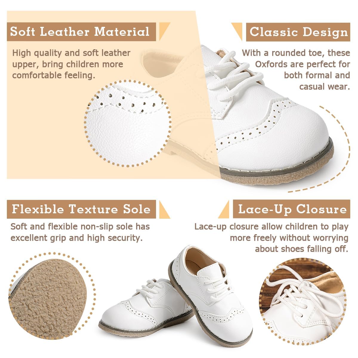 Comfortable Wear: The classic oxfords are designed with laces that can be adjusted to be as loose or tight as you like. Wide rounded toe allows room for your childβs foot to move and grow, ensuring long term comfort