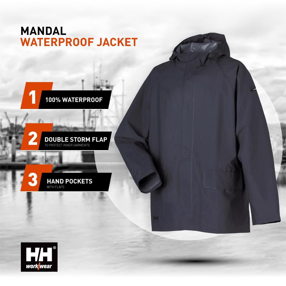 Ultimate Waterproof Protection: The Helly-Hansen Workwear Mandal Waterproof Jacket offers superior defense against rain and wind, ideal for those seeking reliable rain gear. This men's raincoat is engineered for outdoor workers needing heavy duty rain gear for men
