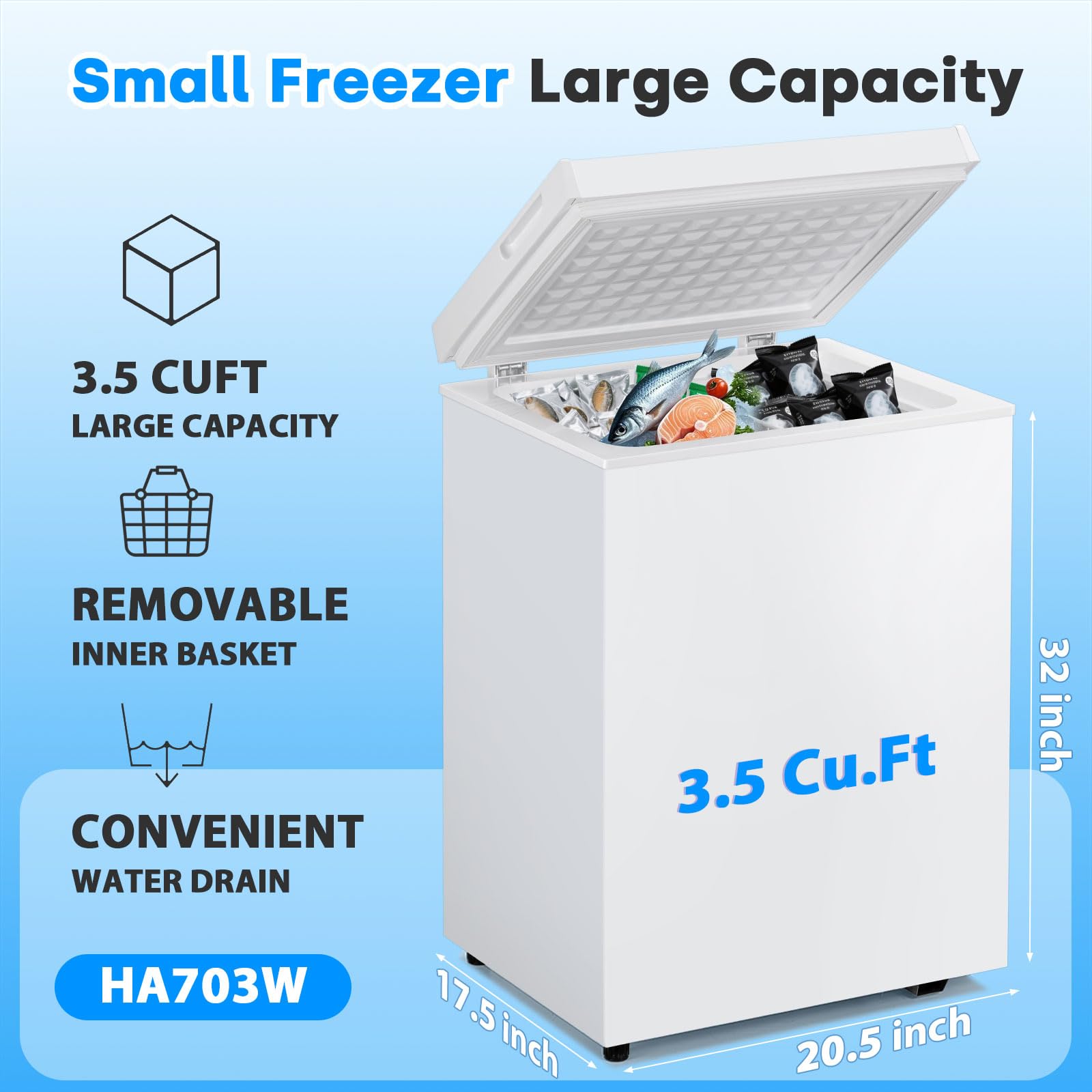 3.5 Cu.Ft Compact Capacity — Offers ample 3.5 cubic feet of storage, perfect for storing meat, seafood, ice cream, and frozen food in apartments, dorms, garages, basements, and offices without taking up much space.