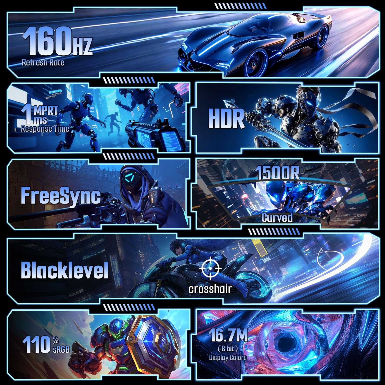 Smooth Gaming: Up to 160Hz Refresh Rate, MPRT 1ms Response Time, Freesync Compatibility. Black level Adjustment, Crosshair, Game Timer, Various Game Modes( FPS/RTS/MOVIE/STANDARD)