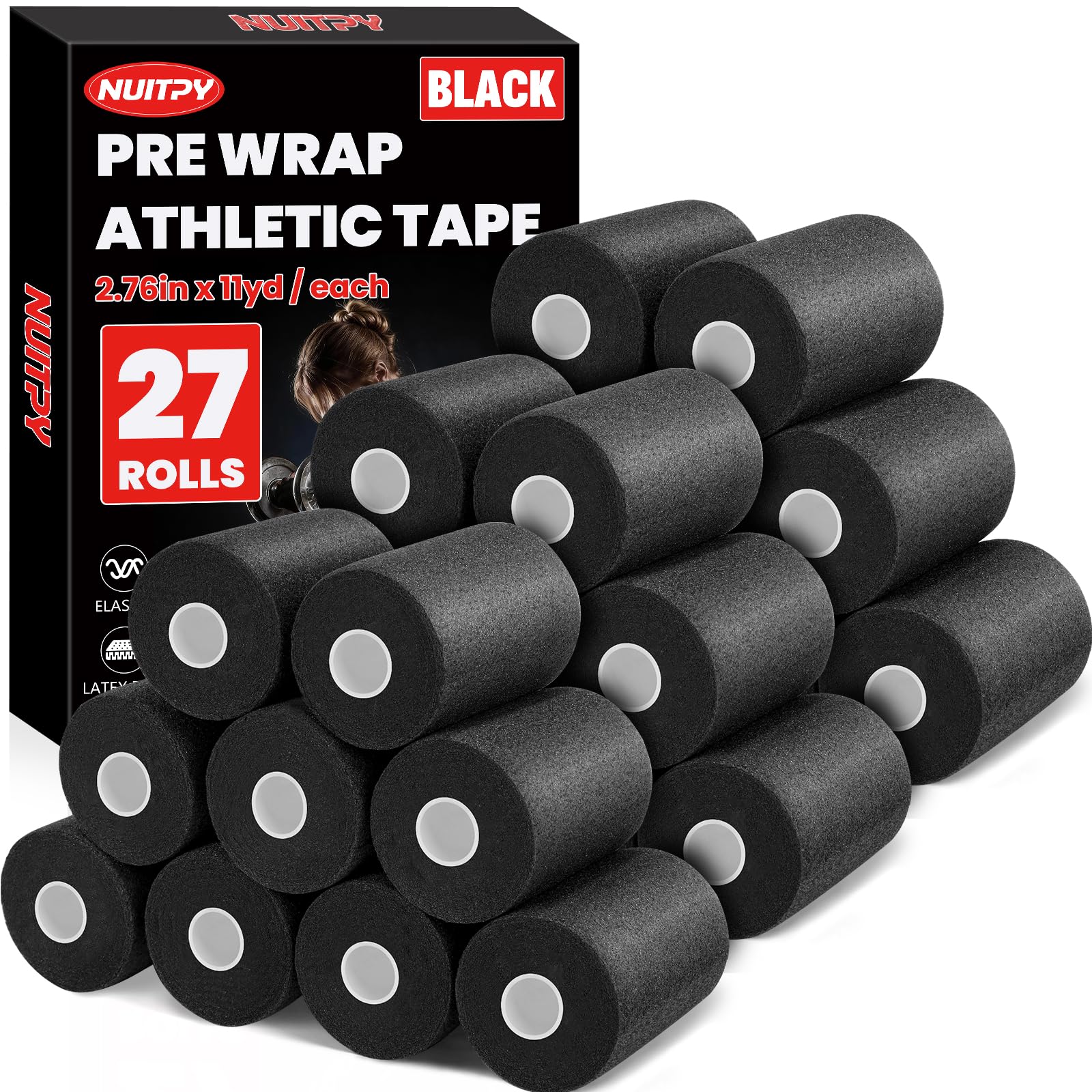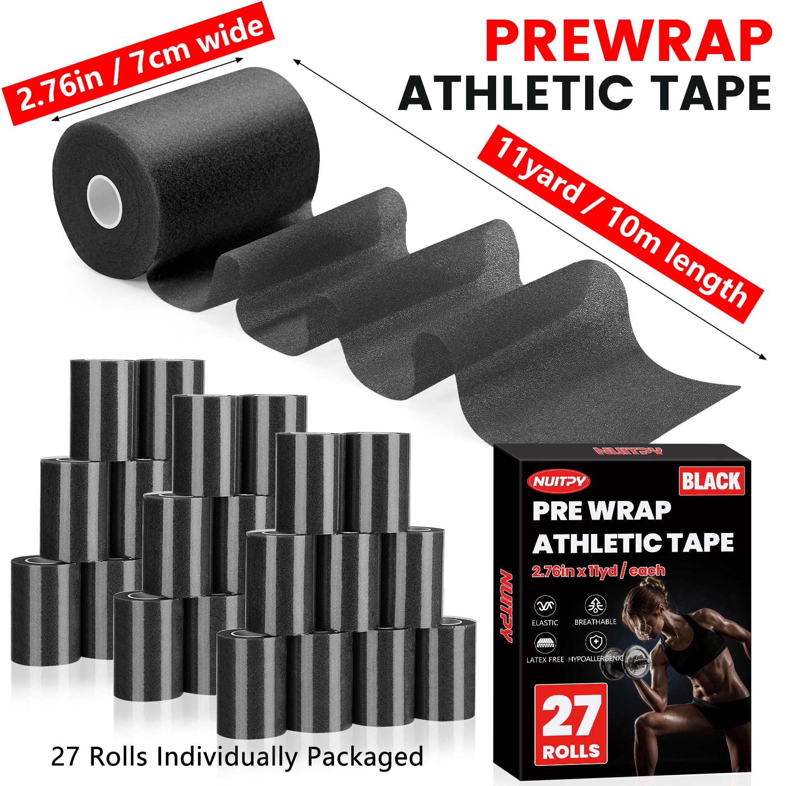 【27 Rolls Pre Wrap Tape】Package includes 27 rolls black pre wrap tape. Each prewrap athletic tape is 2.76 inches wide and 11 yards long, Each roll is made of PU foam and no adhesive included