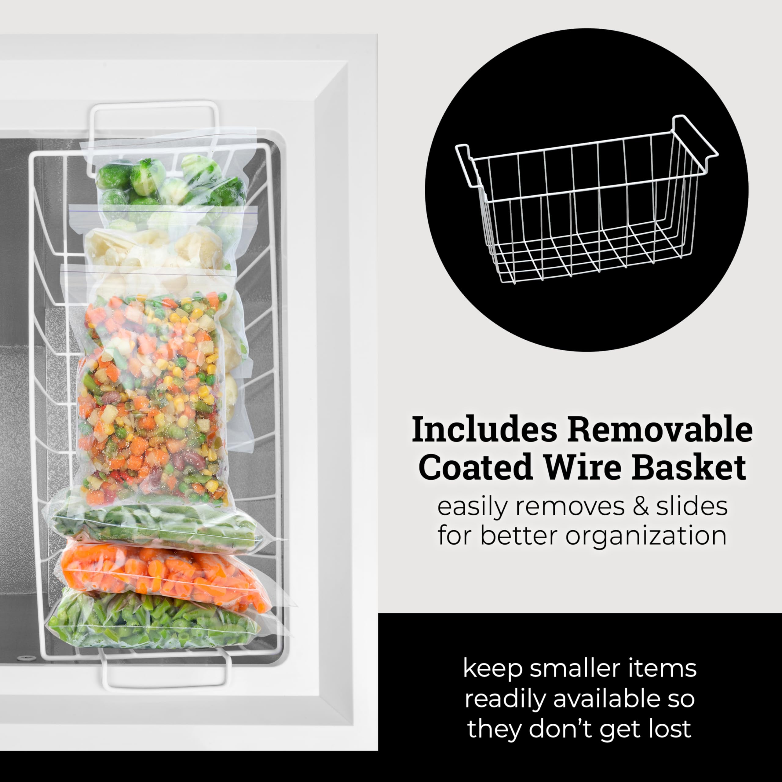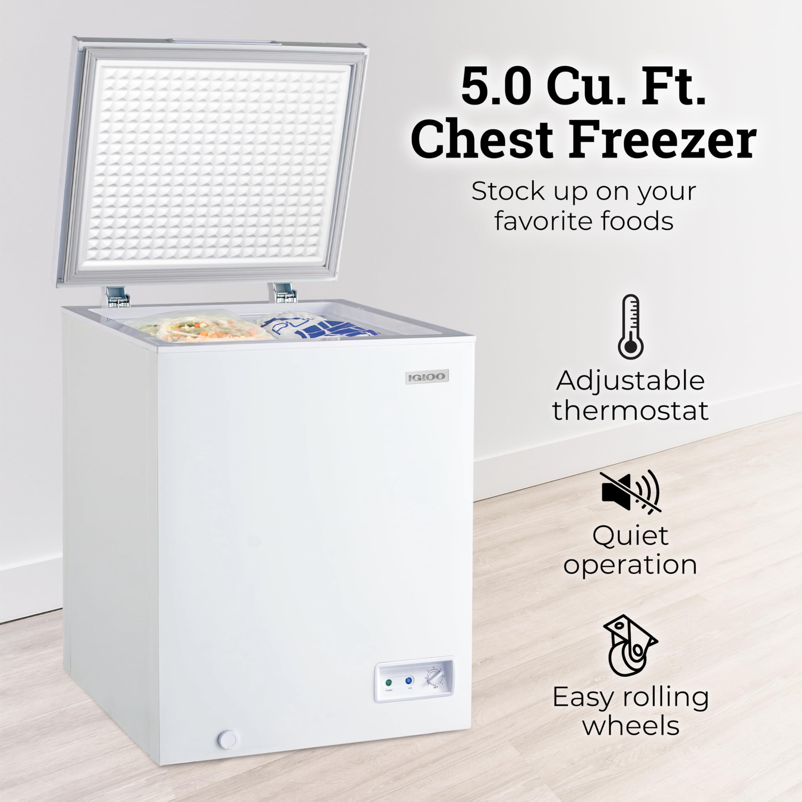 This Igloo 5.0 Cu. Ft. Chest Freezer offers the space to accommodate all your storage needs! Perfect for stocking up on frozen food such as meat, pizza, fruits and vegetables, ice cream, ice and more – this reliable chest freezer has a quick freezing system with a mechanical temperature control that is easily accessible. The convenient and removable storage basket allows you to store the small things you don’t want to get lost!