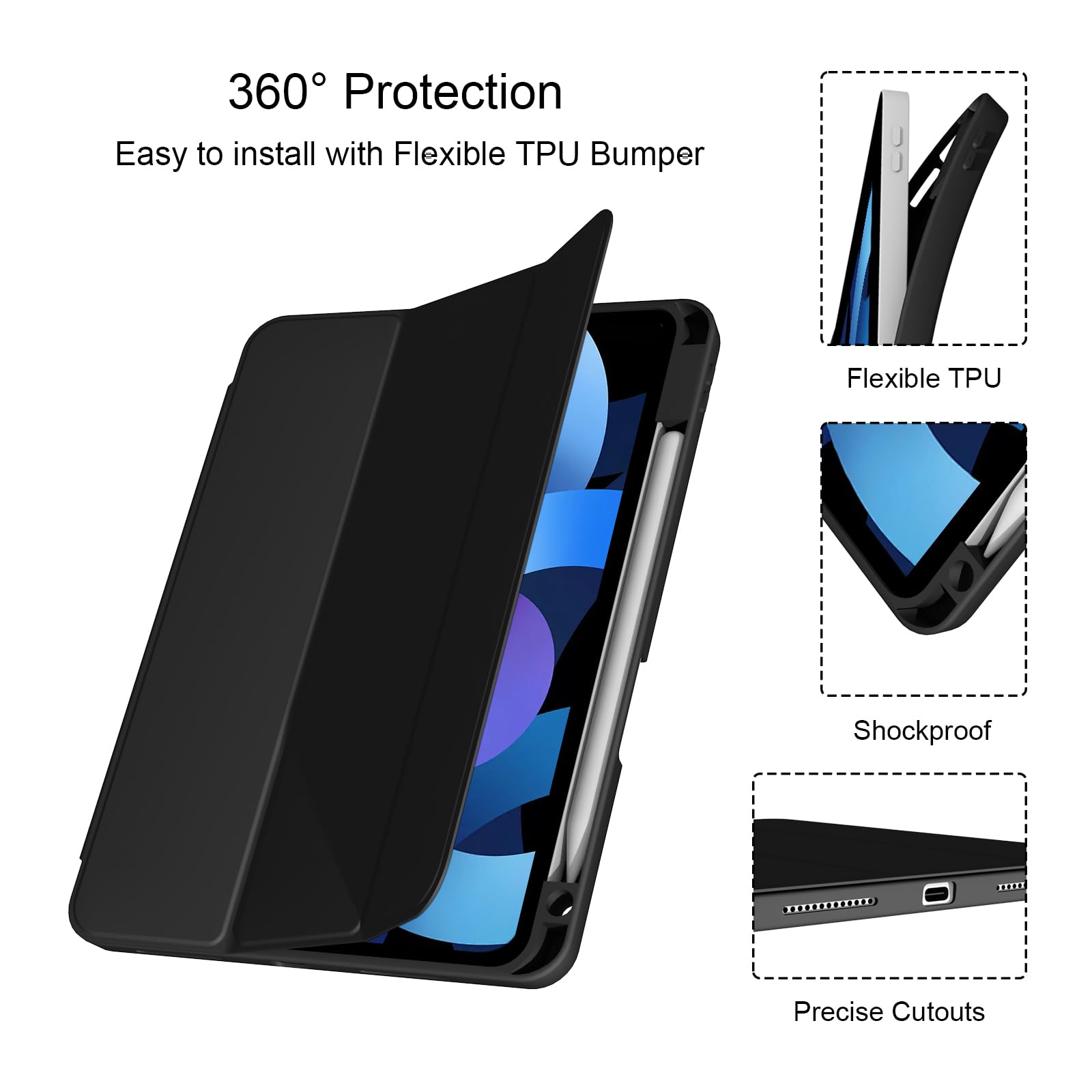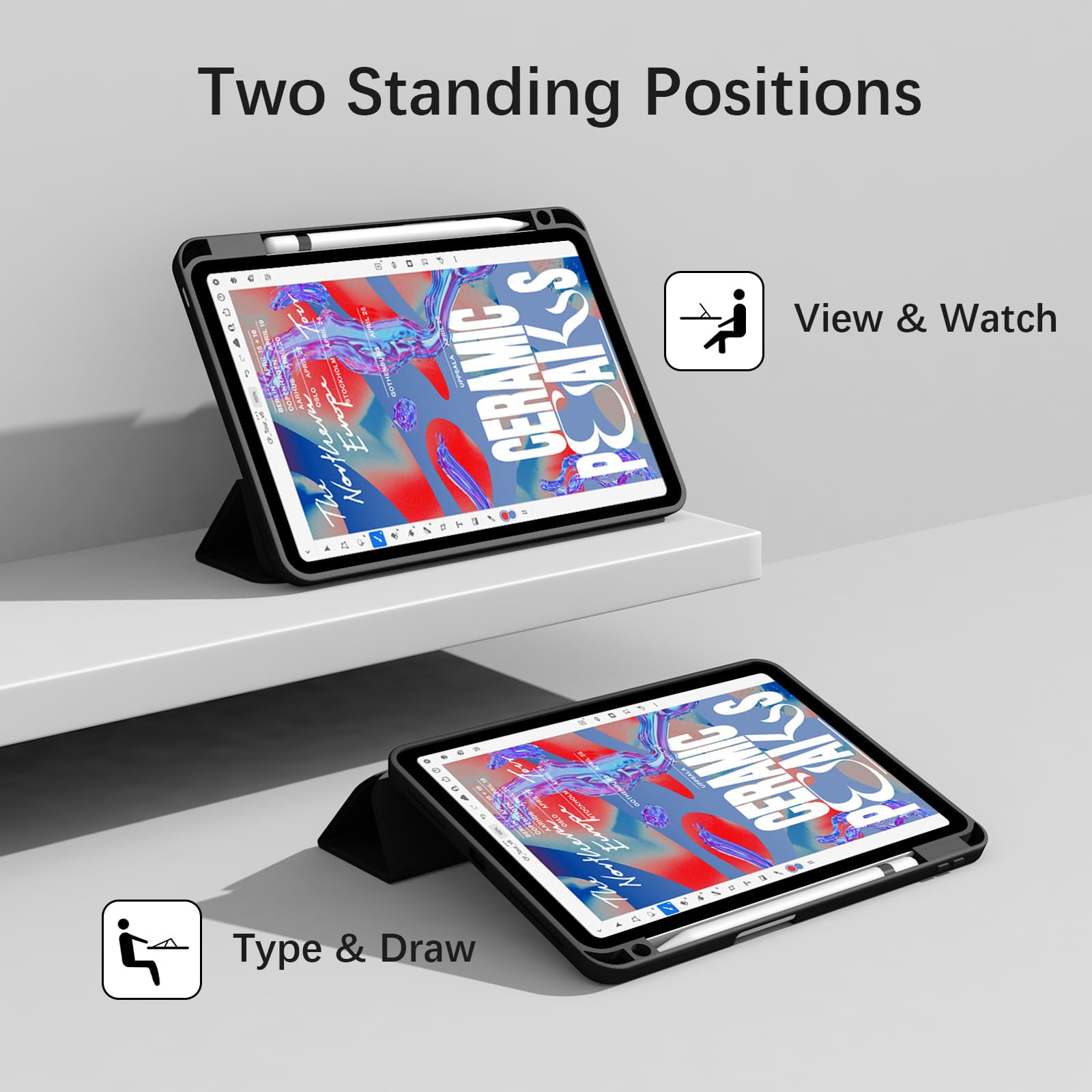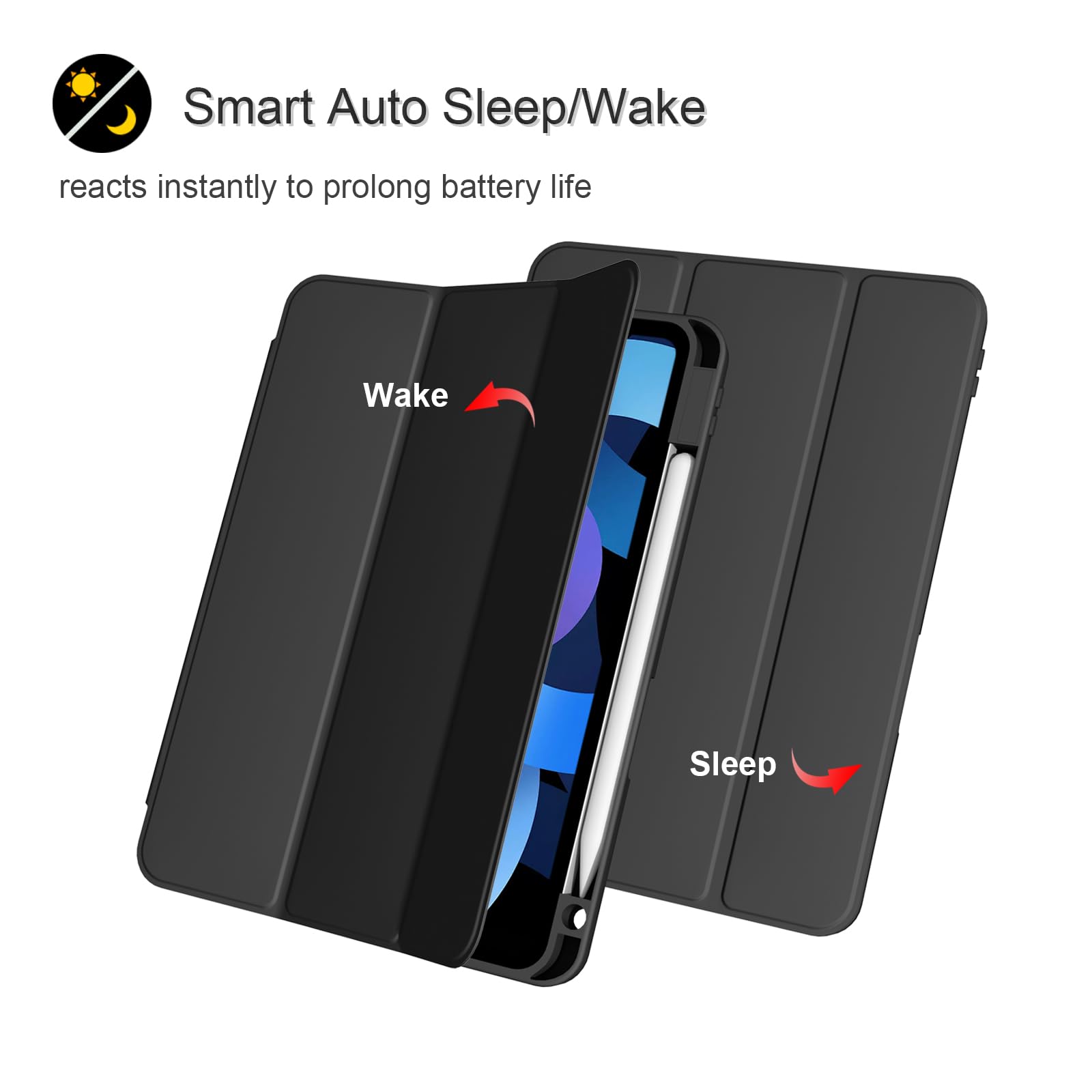 💫【Built-in Apple Pencil Holder&Tri-fold front cover】- Built-in pen slot can stably place the stylus, seamlessly supports Apple Pencil wireless charging when case is on. Tri-fold standing, 65°/30° dual-use support Angle, For viewing and typing ,light and portable. Anti-slip interior design, more stable support.