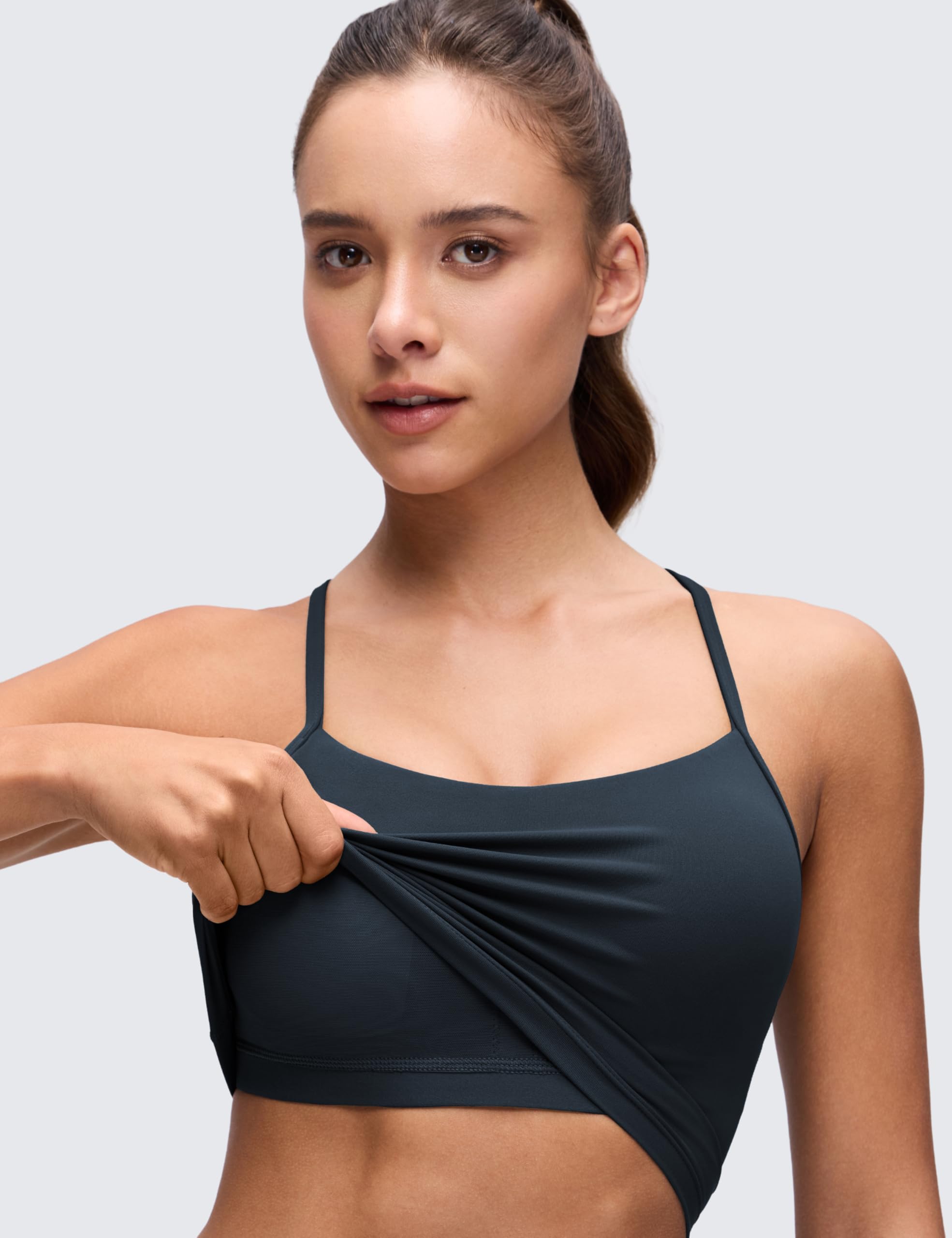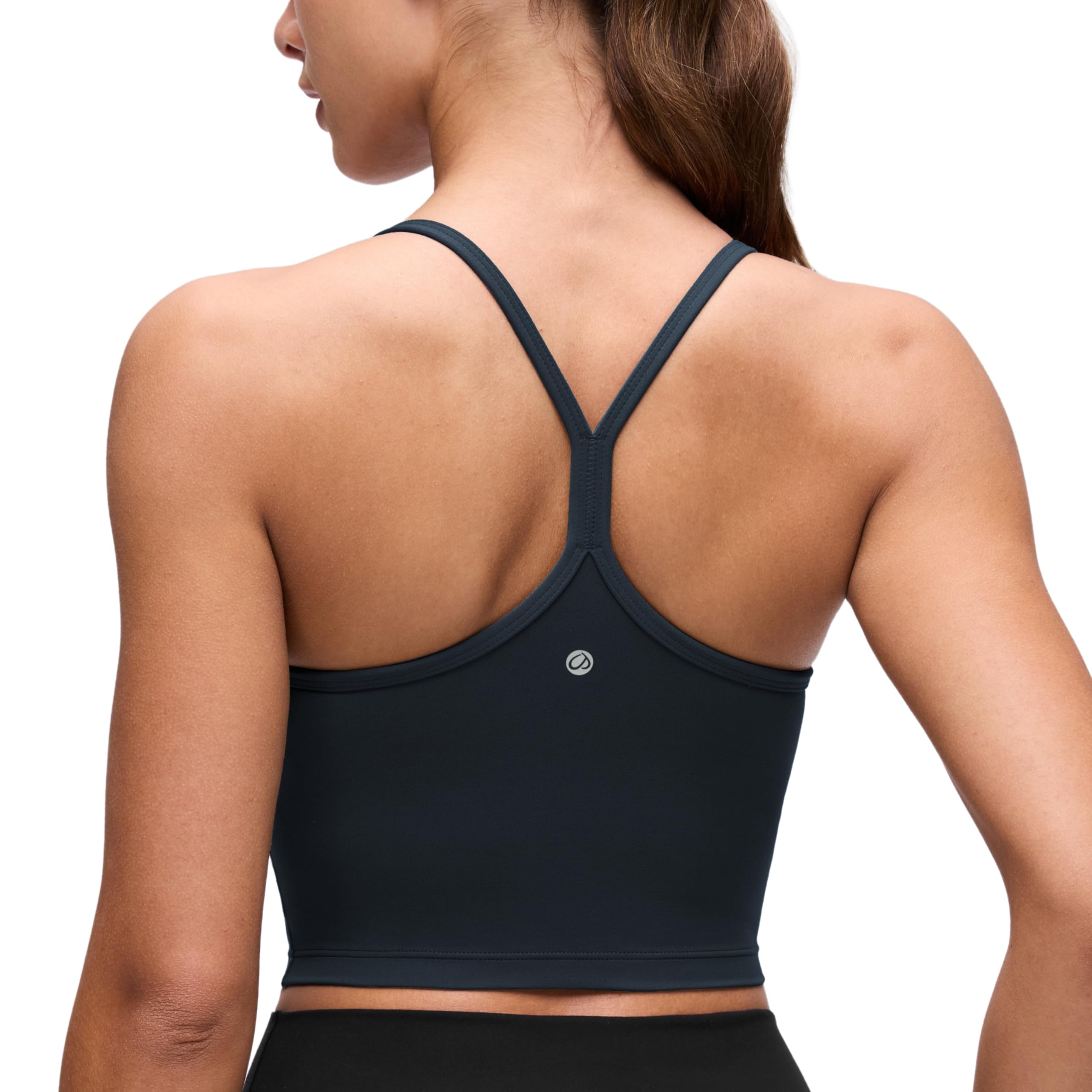 Scoop neckline. Spaghetti strap Y-back design