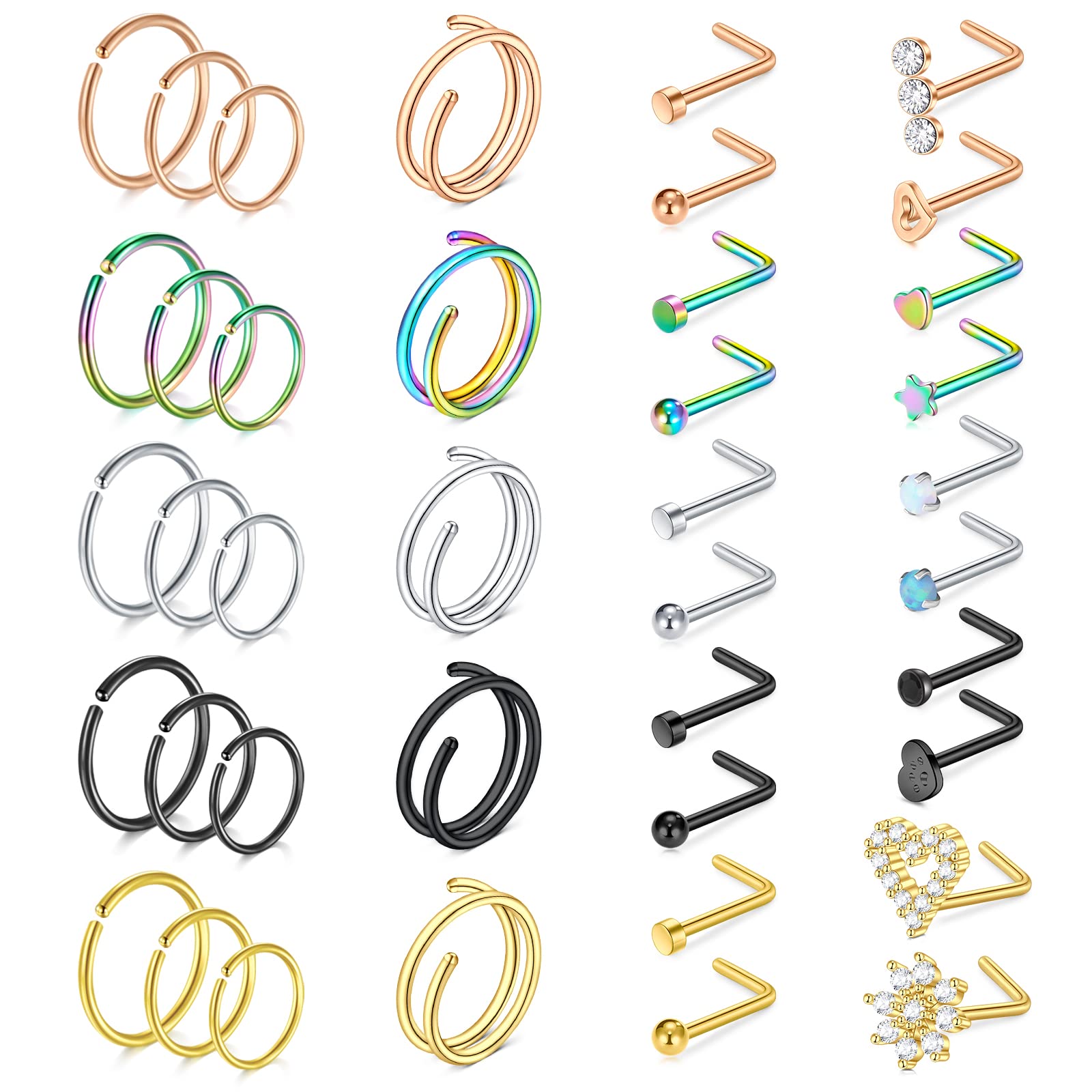Size:All Gauge--20G(0.8mm); Nose hoops inner diameter: 5/16"(8mm), 3/8"(10mm), 1/2"(12mm); Double Nose Ring inner diameter:5/16"(8mm); Nose studs length:7mm