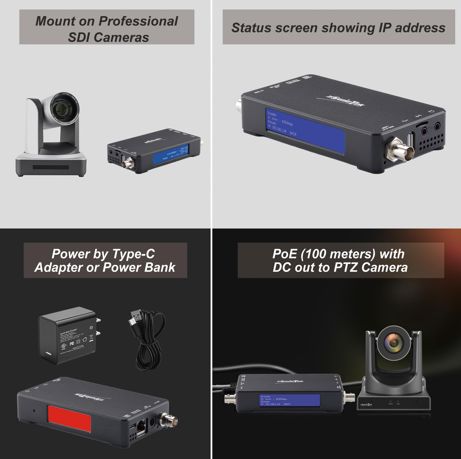 Convenient Use Anywhere: Powered by PoE (100 meters) or USB-C (e.g., power banks, DC to USB-C adapters). It can even power external devices like PTZ cameras via DC out. Mountable on SLR, camcorder or standard tripod.