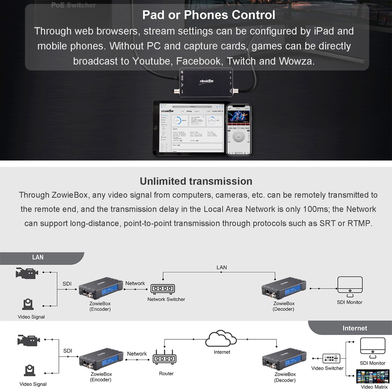 All-around Configuration: ZowieUI allows control of connected PTZ cameras, tally light, video/audio, OSD, work mode, stream, network, and system via PC, phone, or pad. Users can preview videos and access the dashboard. ZowieX software simplifies the detection, installation and batch upgrade of ZowieBox.