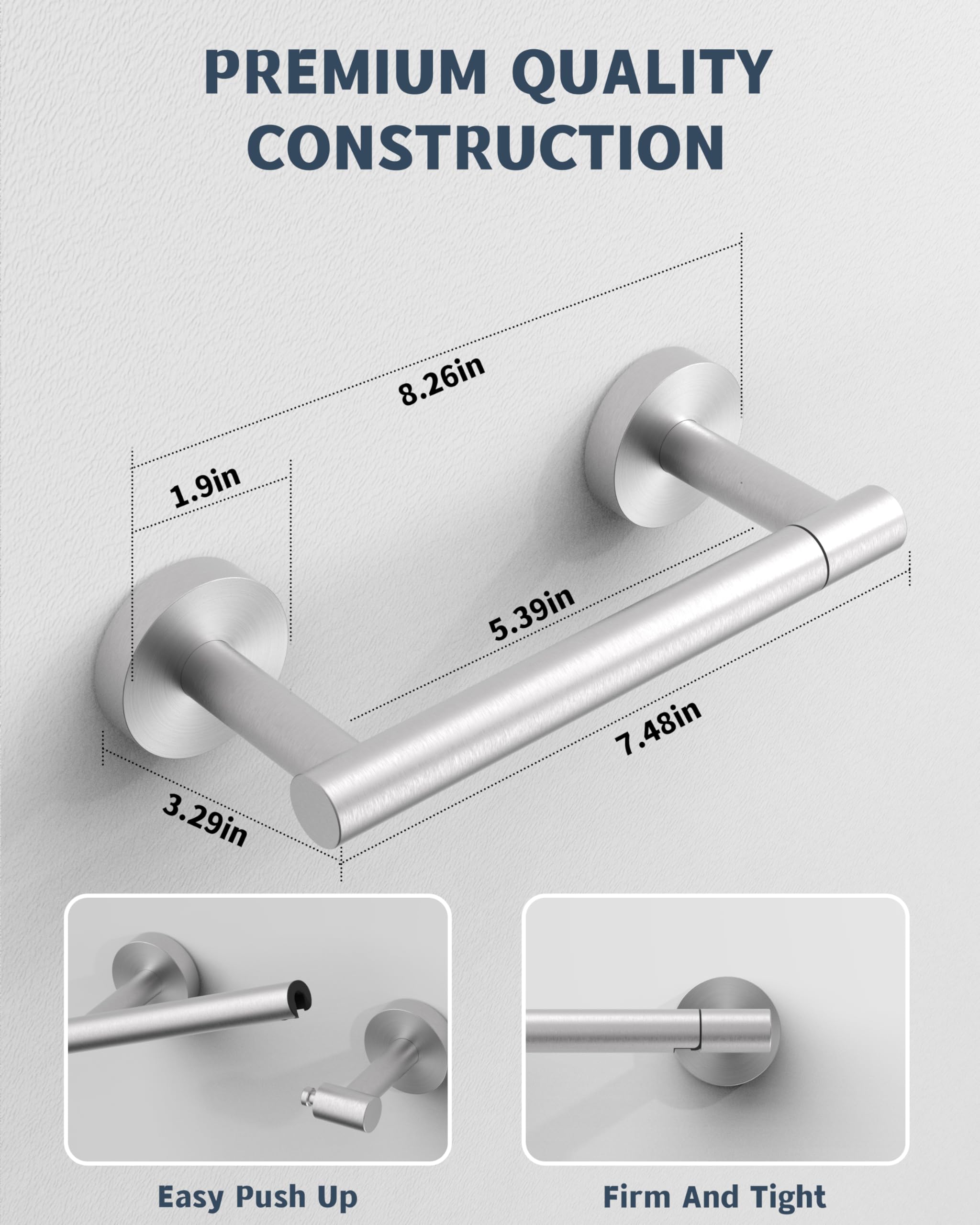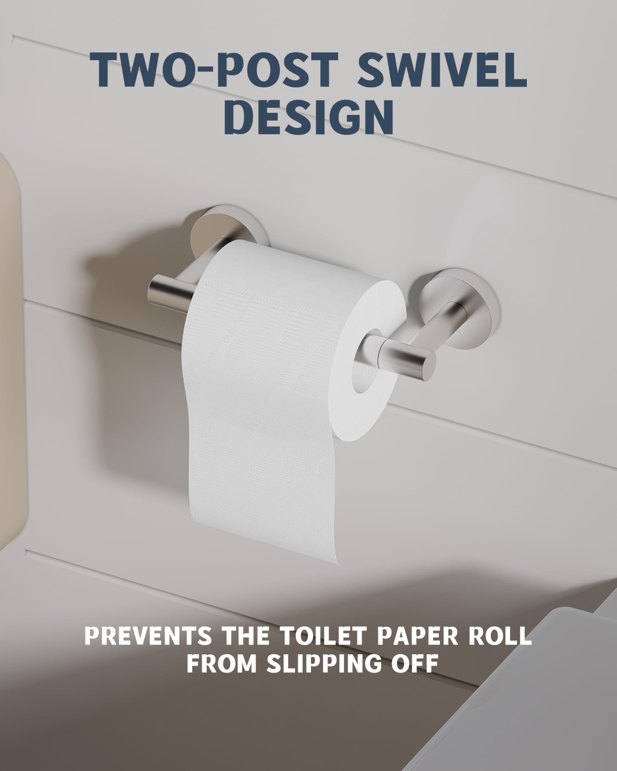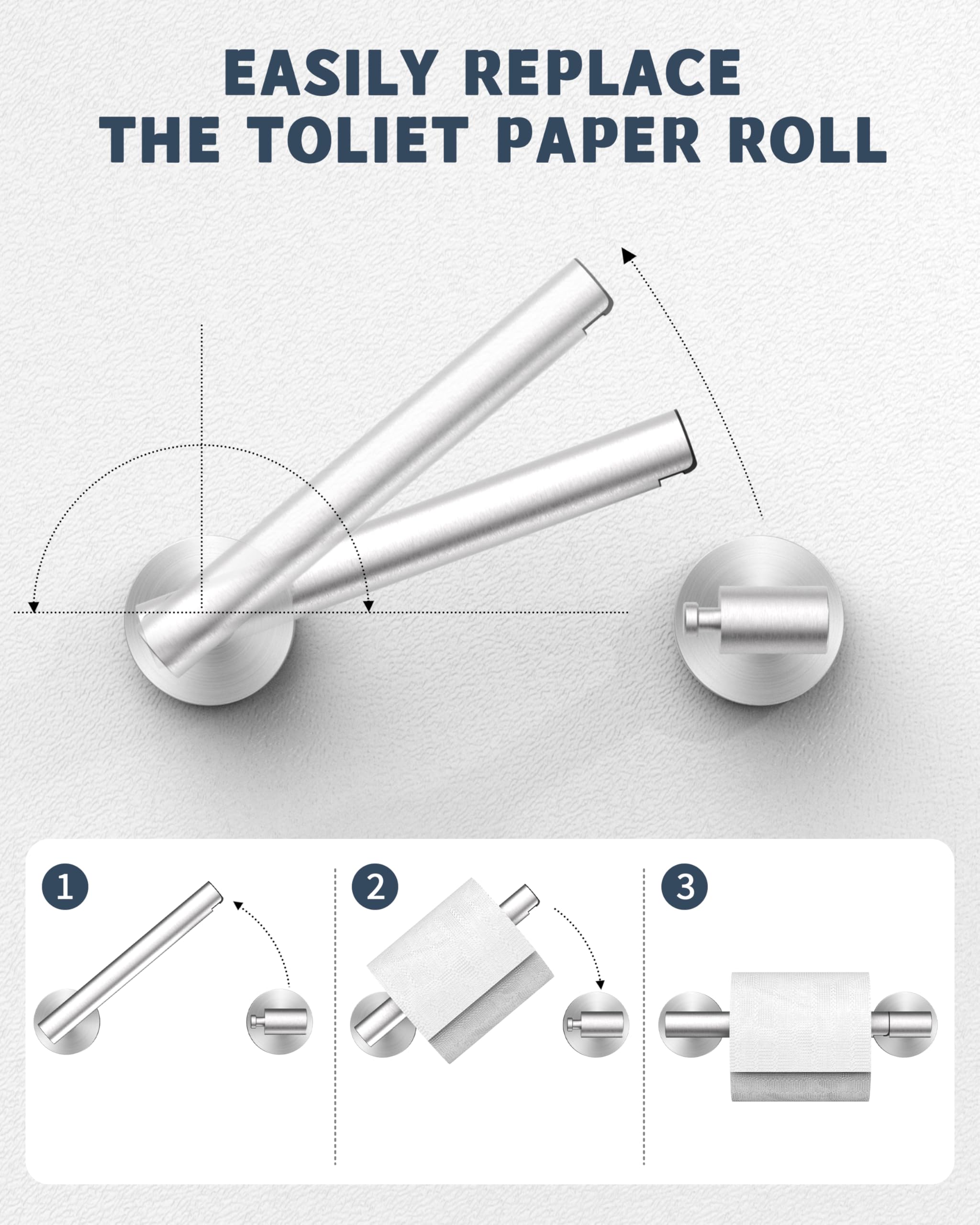 【Easy to Replace】The rotating brushed nickel toilet paper holder of the double column movable makes it easier and simpler to change your toilet paper, just lift the bar to remove the old one and put in the new one, no need to worry about losing the spring with the traditional spring design. The compact size helps maximize storage for your bathroom and kitchen space. This unit is a great bathroom accessories for any hotel, farmhouse or RV