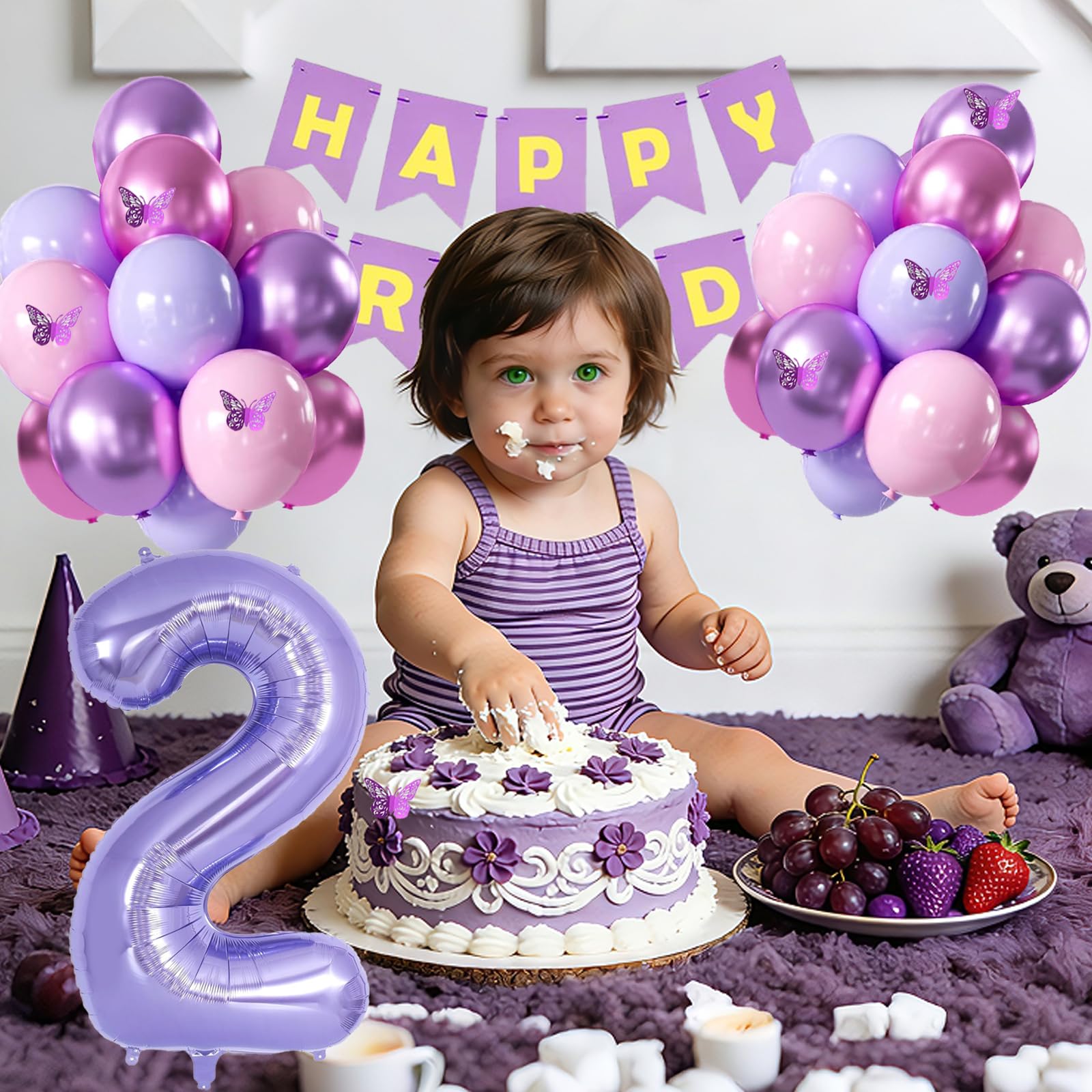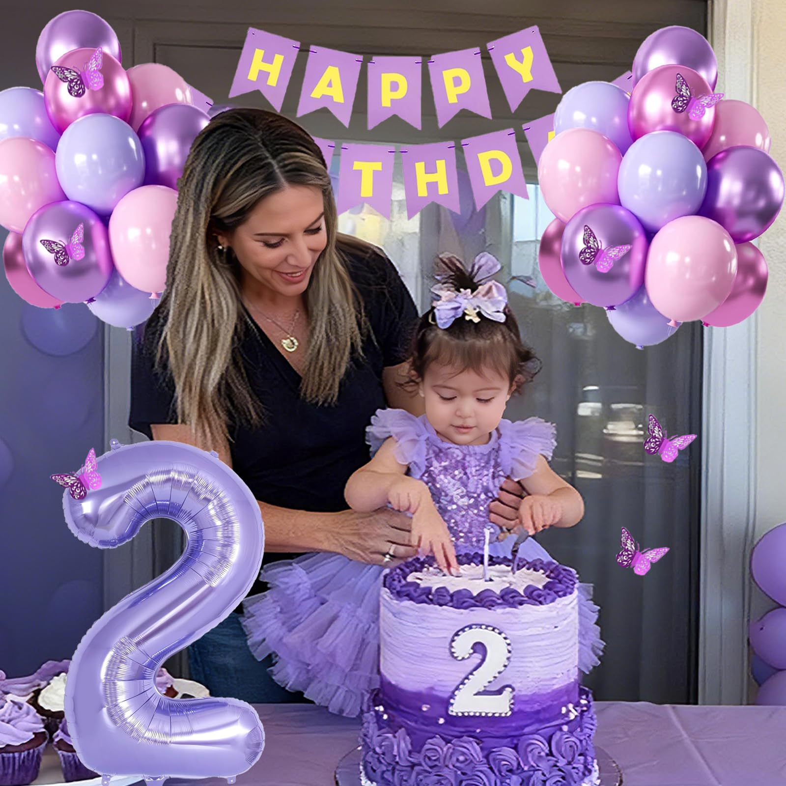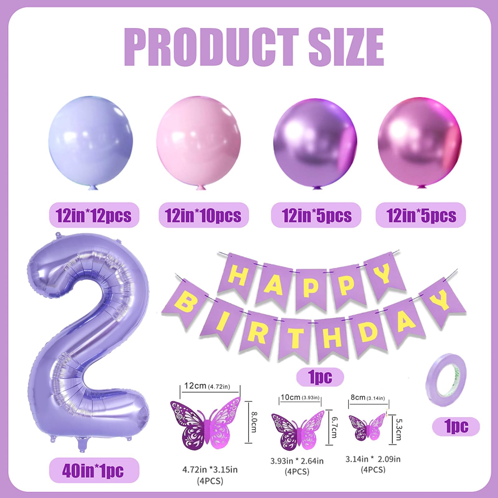 【VALUABLE PACK】40pcs 2nd birthday decorations girl include: 40inch Purple 2 balloon, Purple HAPPY BIRTHDAY banner, 12inch balloons( past purple) x 12pcs,12inch balloons(pink ) x 10pcs,12inch balloons(Metal purple) x 5pcs,12inch balloons(Metal pink) x 5pcs, 3D butterflies stickers and 1 roll ribbon.