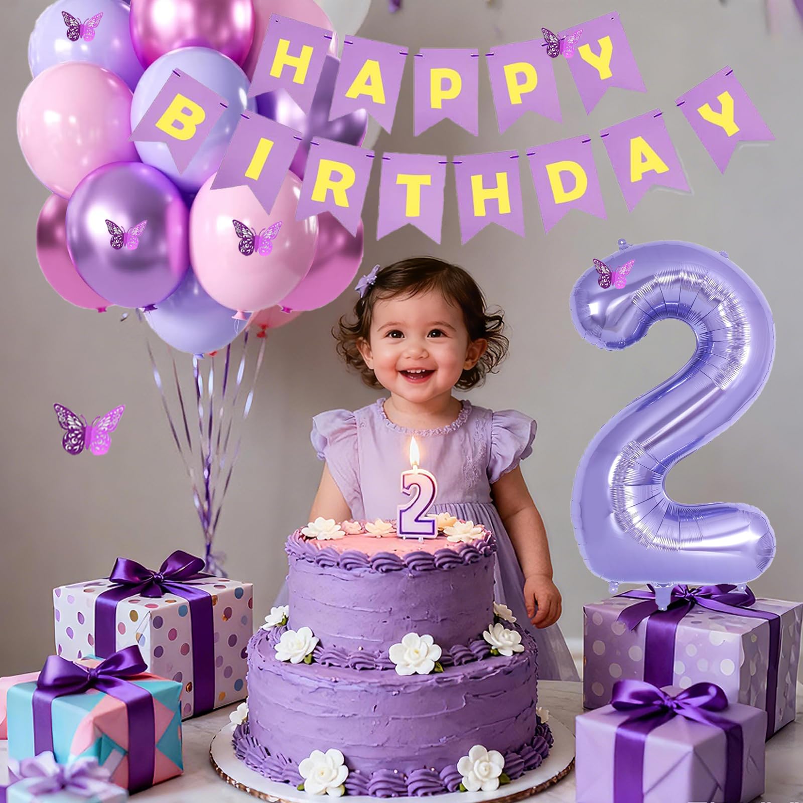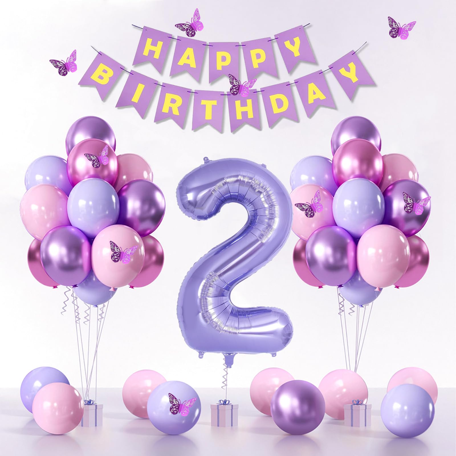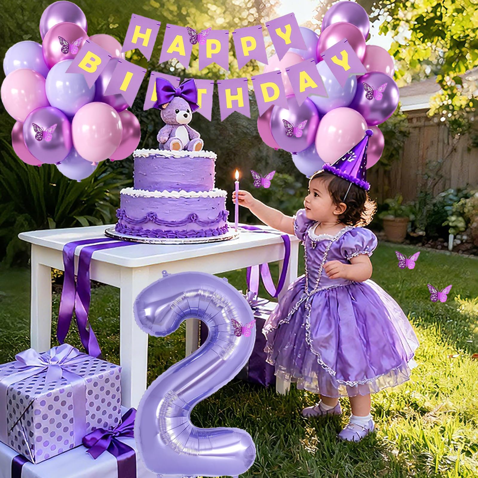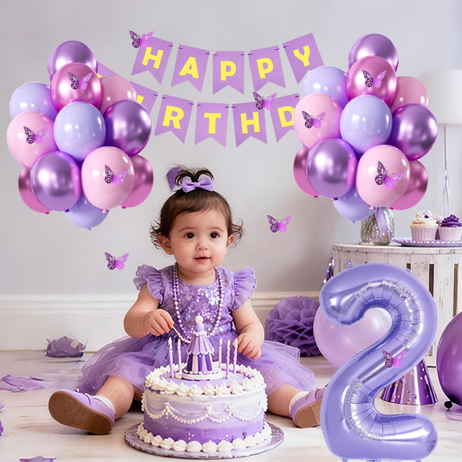 【VALUABLE PACK】40pcs 2nd birthday decorations girl include: 40inch Purple 2 balloon, Purple HAPPY BIRTHDAY banner, 12inch balloons( past purple) x 12pcs,12inch balloons(pink ) x 10pcs,12inch balloons(Metal purple) x 5pcs,12inch balloons(Metal pink) x 5pcs, 3D butterflies stickers and 1 roll ribbon.