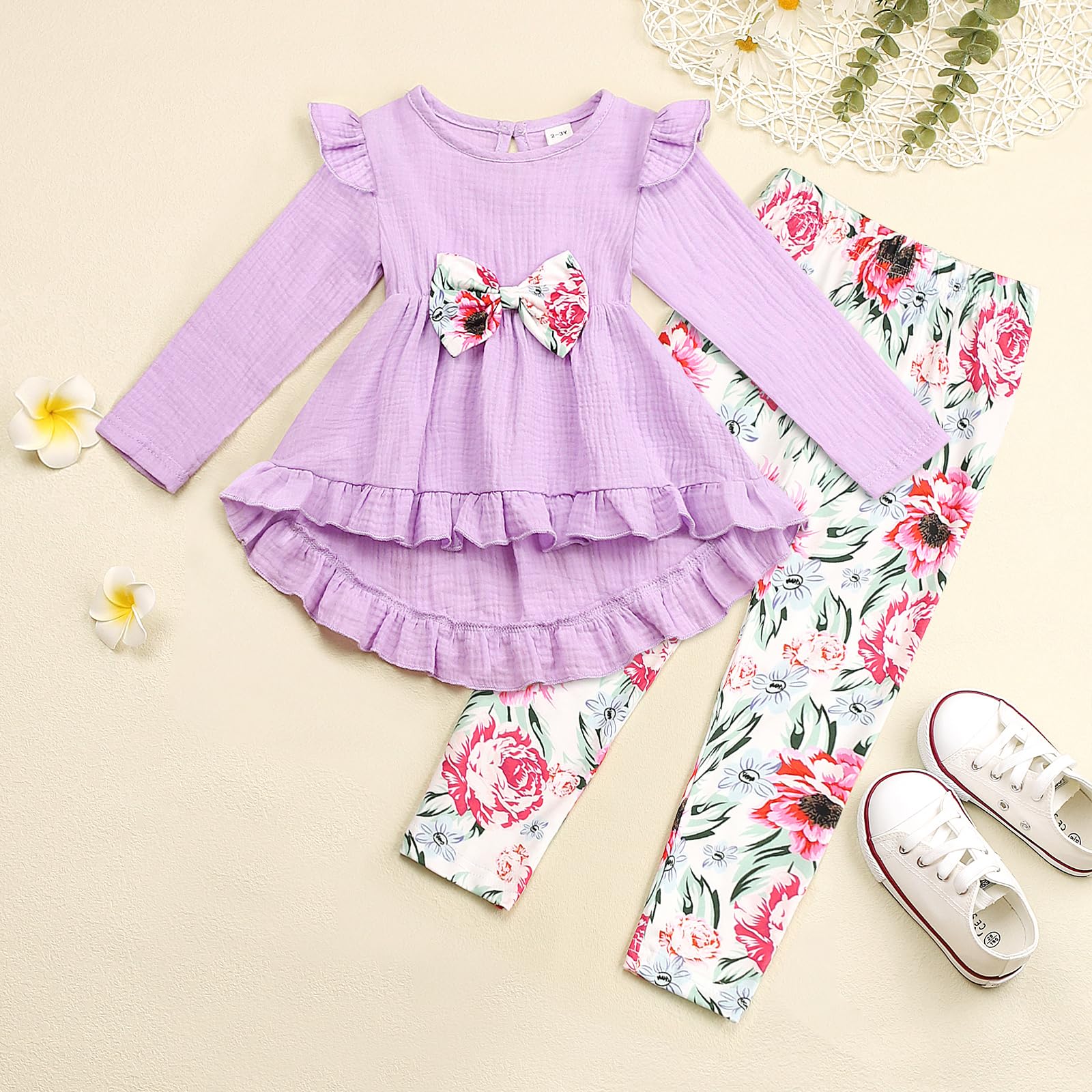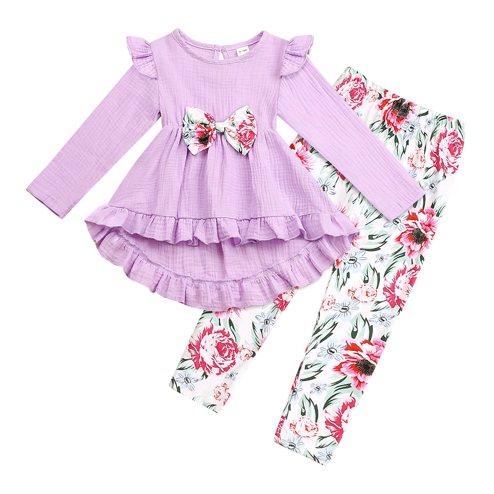 Cute Stylish Girls Outfits: Kid Girl Ruffled Bowknot Design High Low Long-sleeve Tee and Floral Print Leggings, Lovely girls 2 piece fall and winter outfit set.