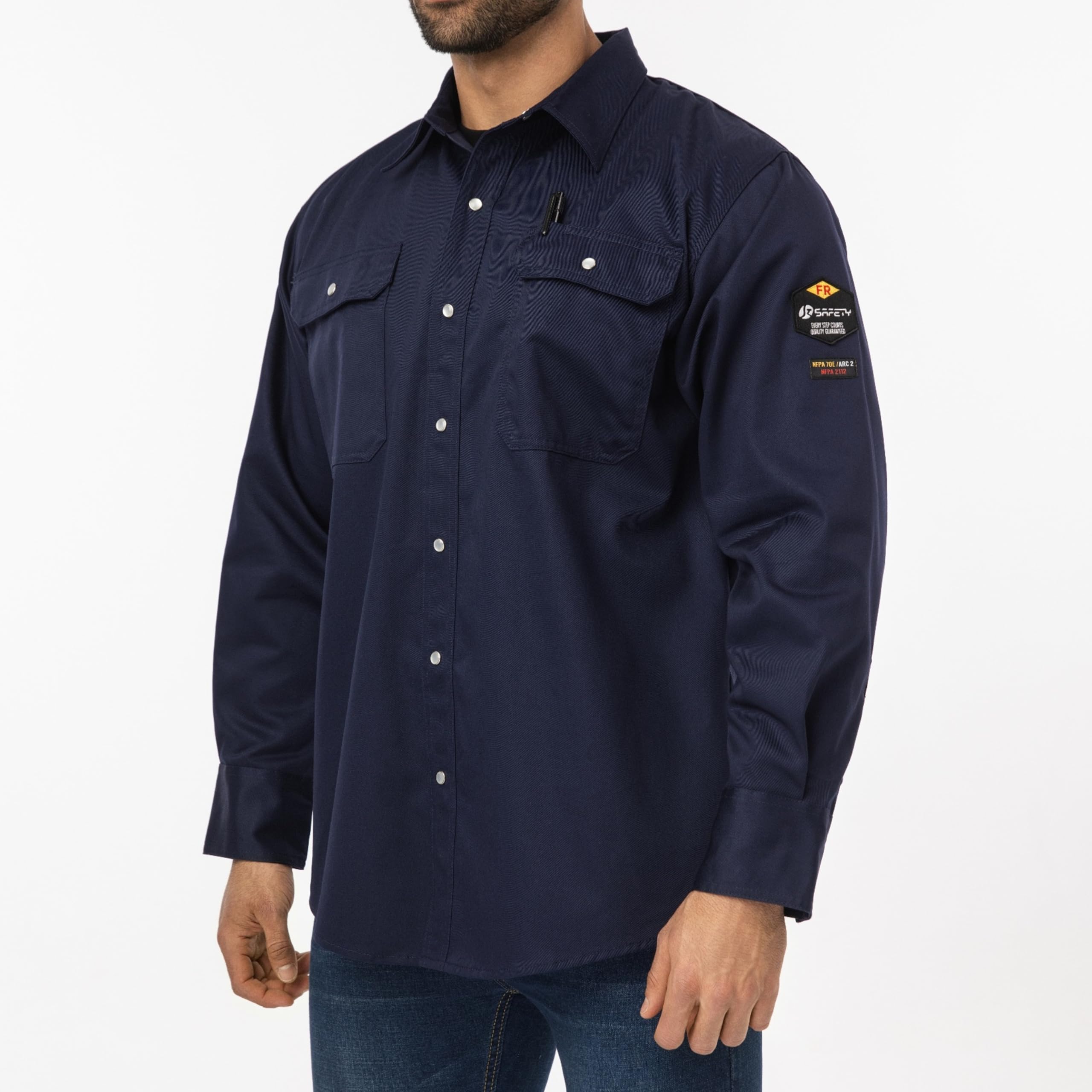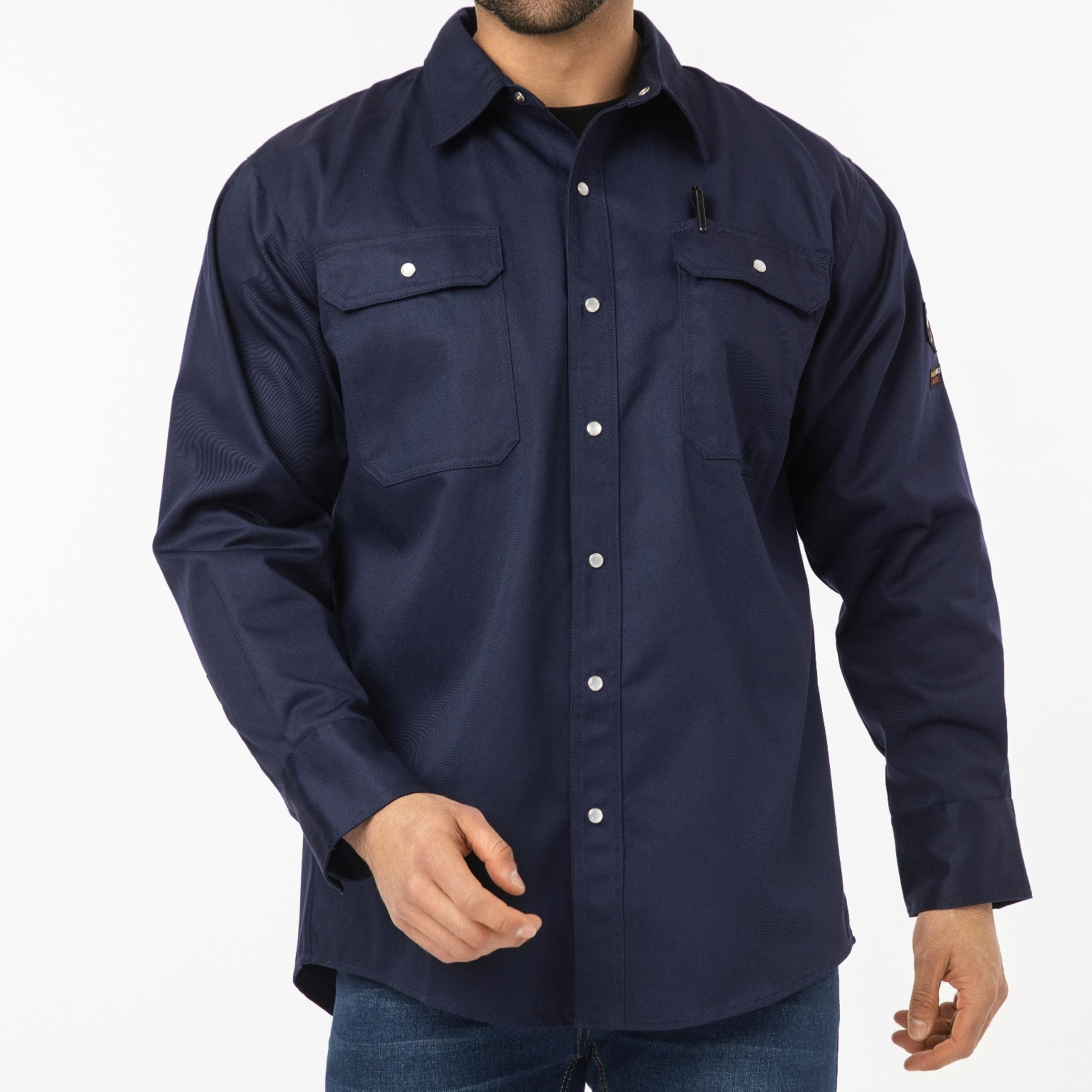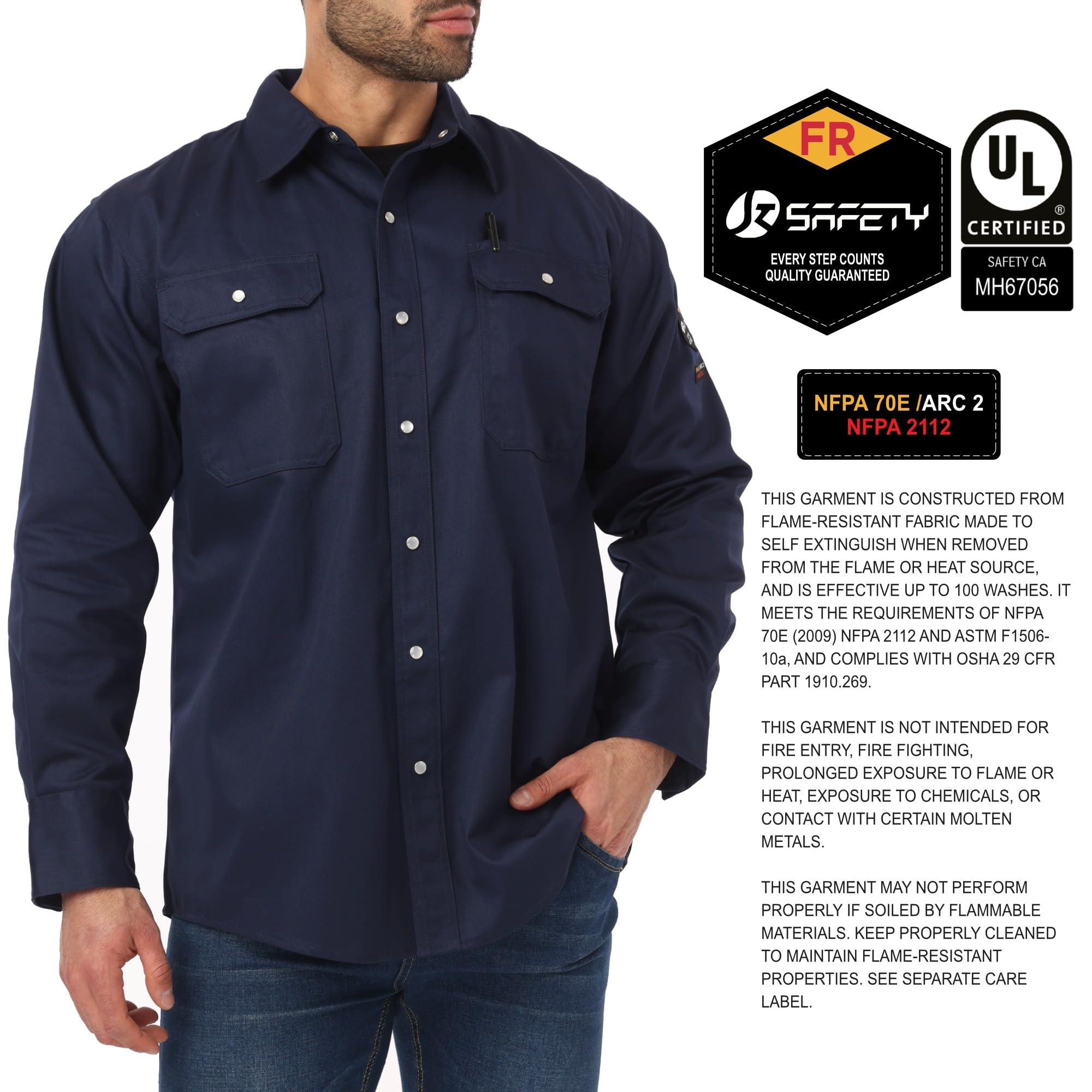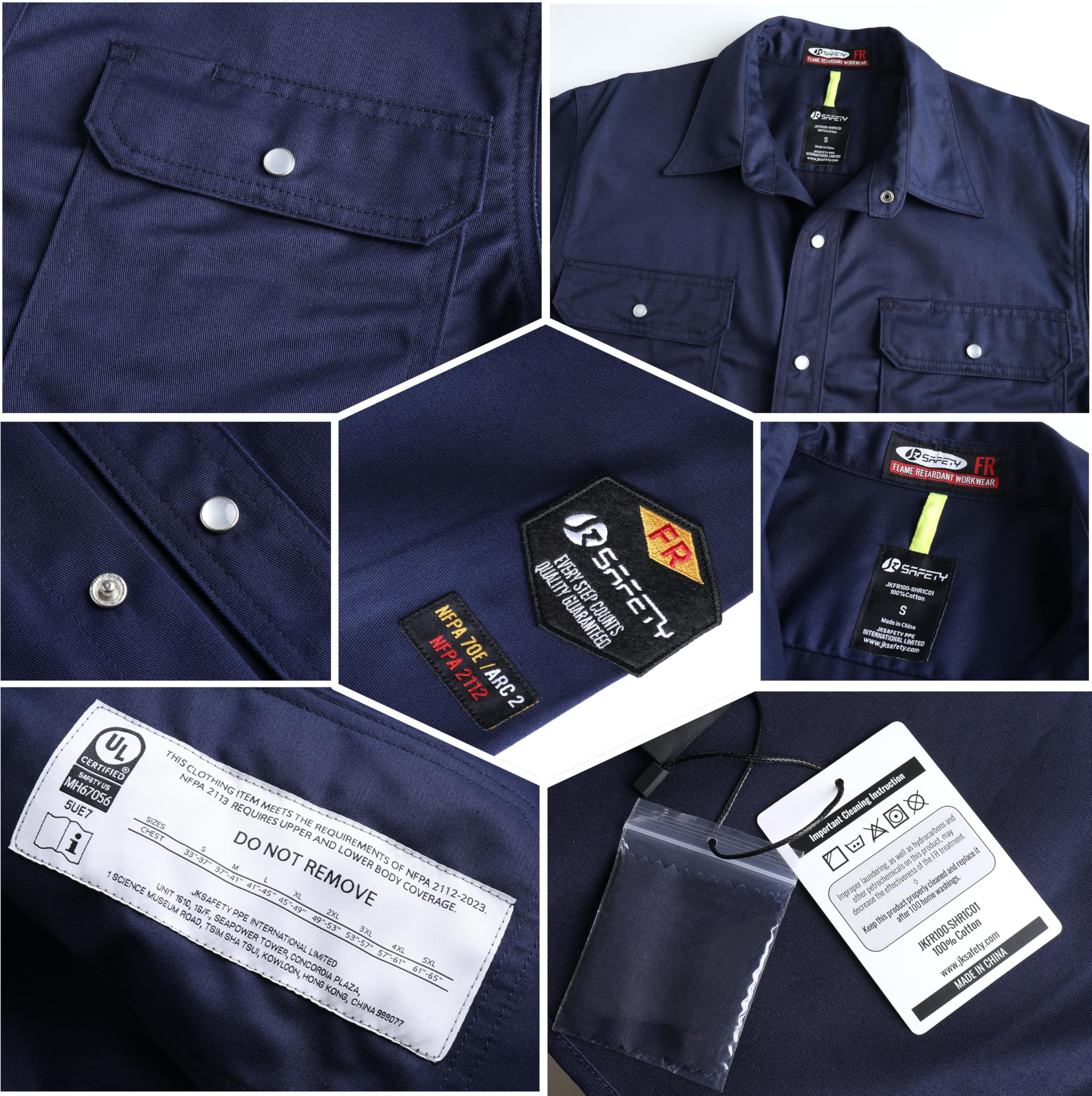 Flame Resistant Shirts: The JKSafety 7oz 100.00% cotton FR long sleeve shirts for men is crafted from durable FR fabric; The fr shirts resists fire without dripping or melting. The FR Clothing complies NFPA 70E and NFPA 2112 standards with an ARC Rating of CAT 2, certified by UL for reliable flame-resistant performance. They offer protection for men and women safety in high-risk environments exposed to sparks, flames and heat. Note: A small FR garment sample have been attached for inspection.