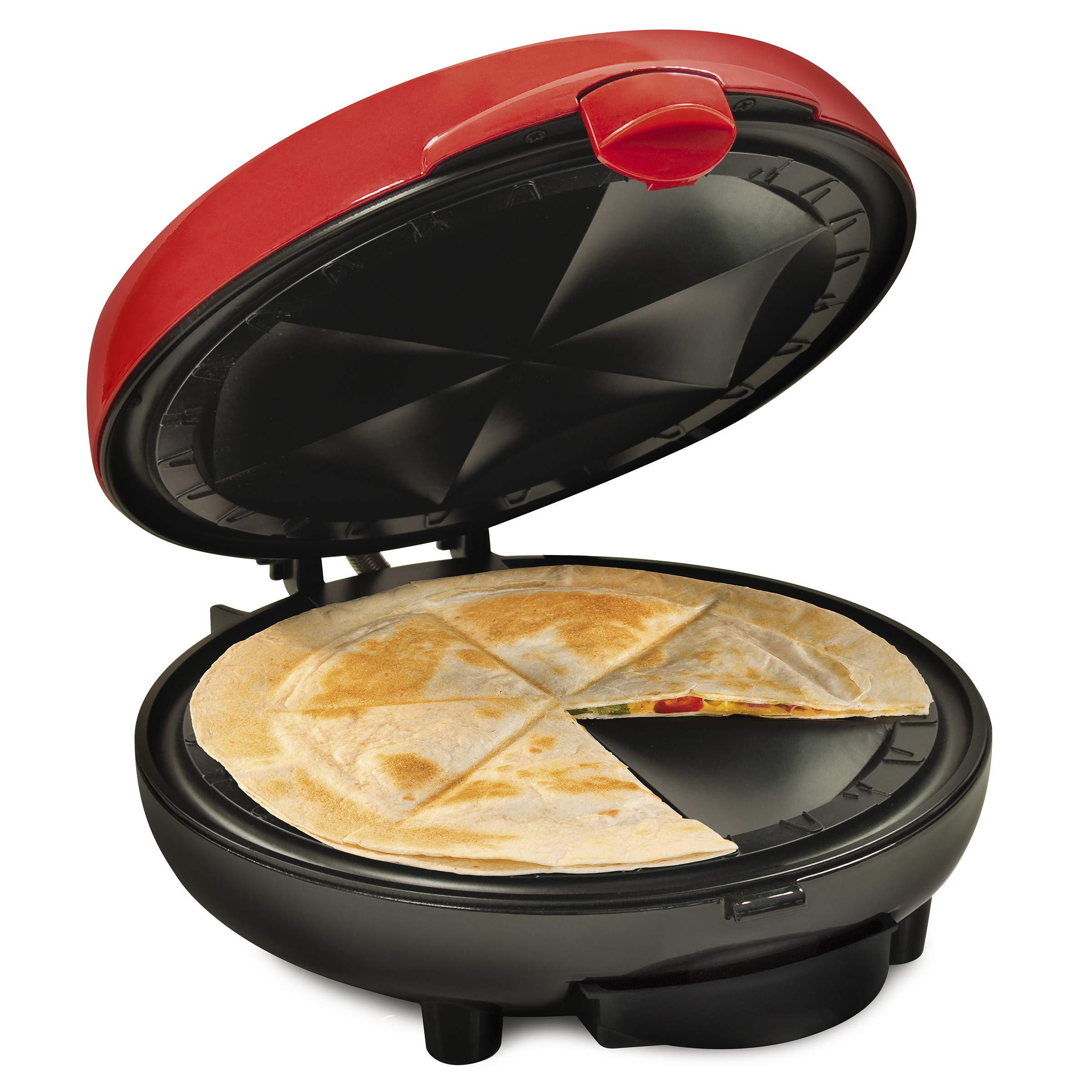 Bring the fiesta right into the kitchen and create crispy and delicious quesadillas quickly. The extra stuffing latch allows for more filling and the plate design creates 6 wedges that seal in the flavor. With the non-stick surface cleanup is simple. Cooks quesadilla in just minutes.