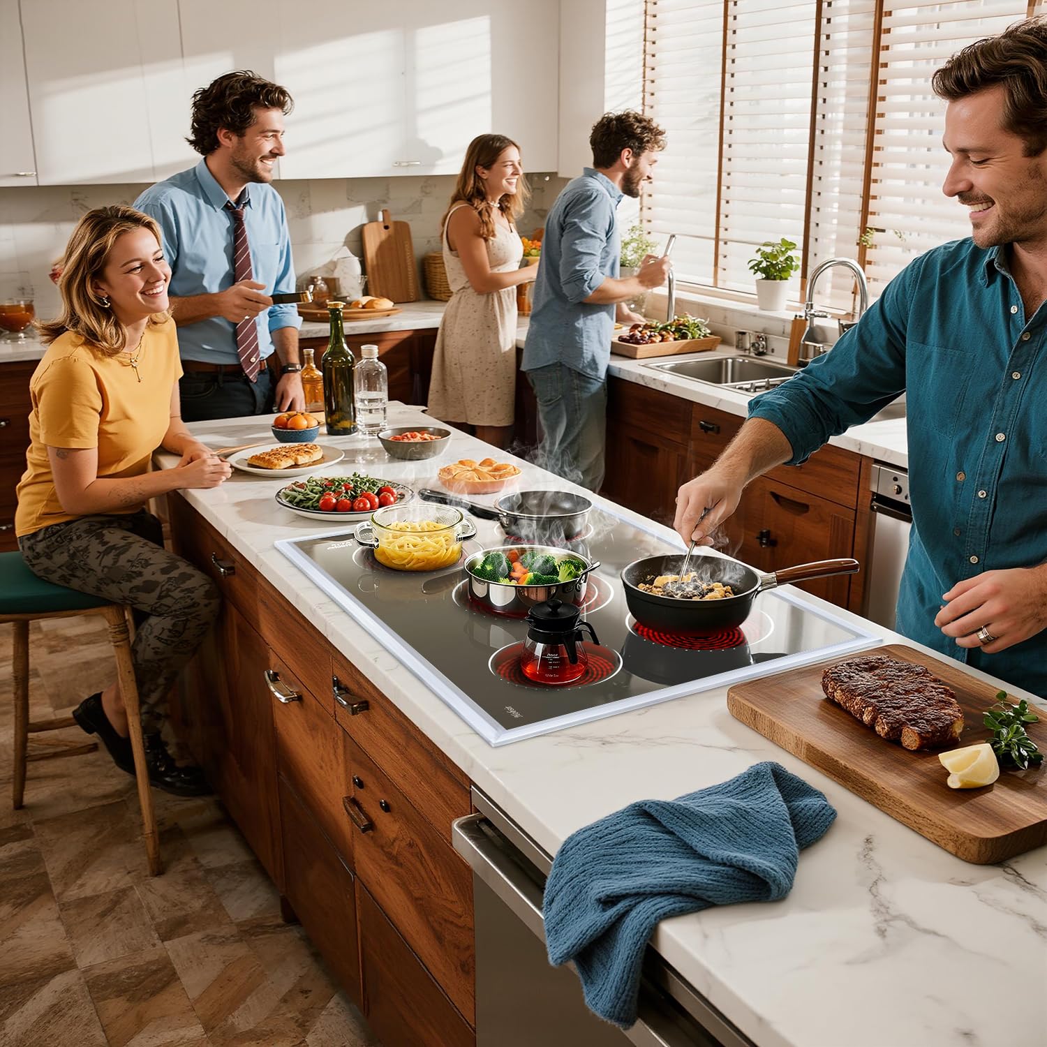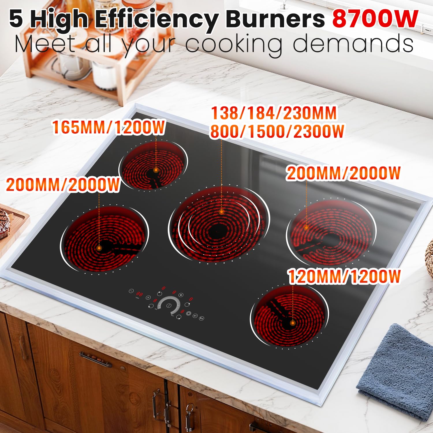 【Powerful 8700W Cooking Performance】30 inch electric cooktop delivers a robust 8700W of total power, featuring five versatile burners. It includes dual 1200W and dual 2000W burners for everyday cooking, plus a innovative triple-ring center burner (800W/1500W/2300W) for maximum flexibility. Perfect for any kitchen needing high performance.
