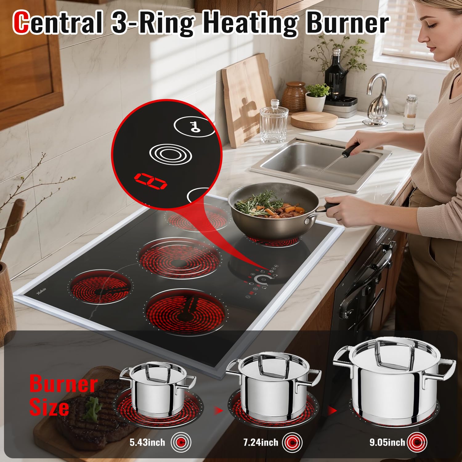 【Versatile Triple-Ring Burner for Precision Cooking】The advanced triple-ring center burner on this electric cooktop 30 inch offers three distinct cooking zones (5.43"/7.24"/9.05") with variable power levels. 5 burner electric cooktop accommodates all pot sizes with ease, providing precision heating from gentle simmering to rapid boiling.