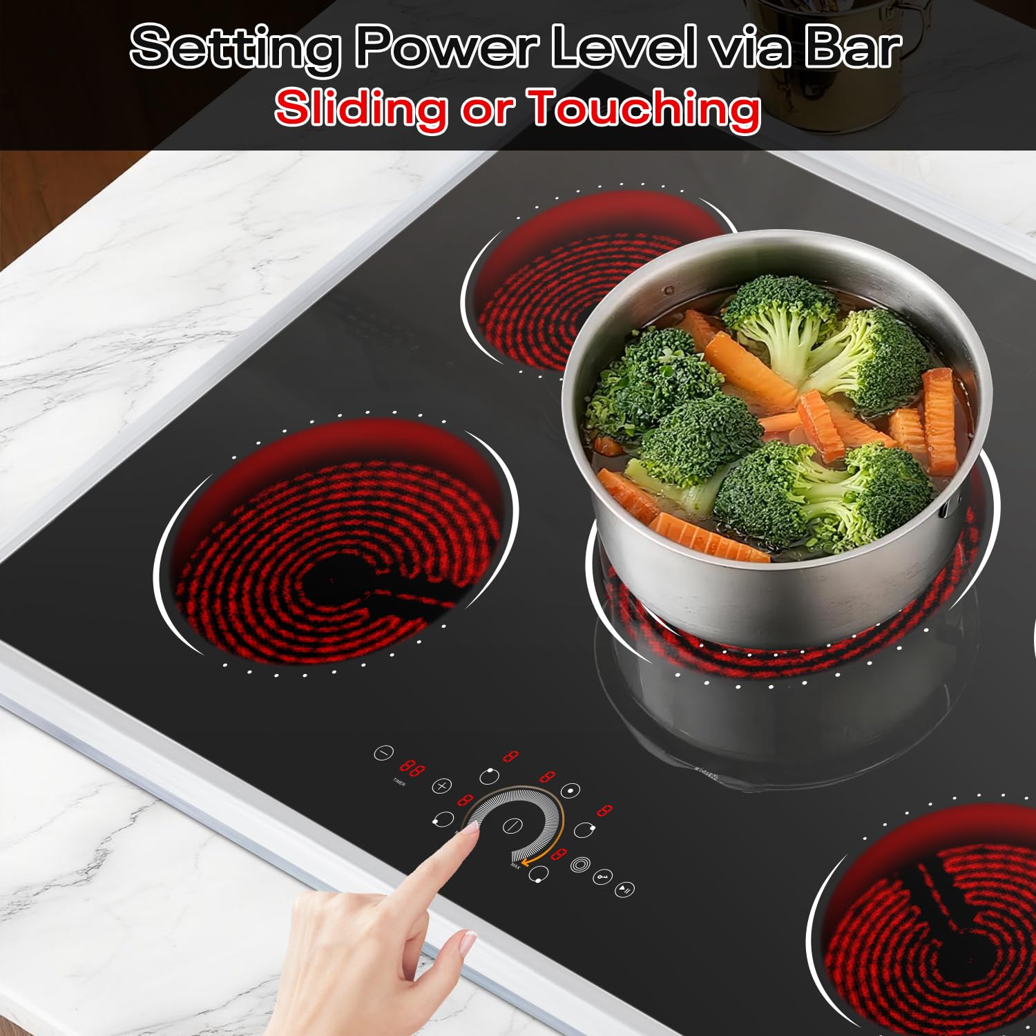 【Sleek Slide & Touch Power Control】Control this electric stove top 30 inch with intuitive slide or touch controls, featuring 9 precise power levels. 30 cooktop electric sleek interface allows effortless adjustments, making it simple to achieve the exact heat setting you need for any recipe.