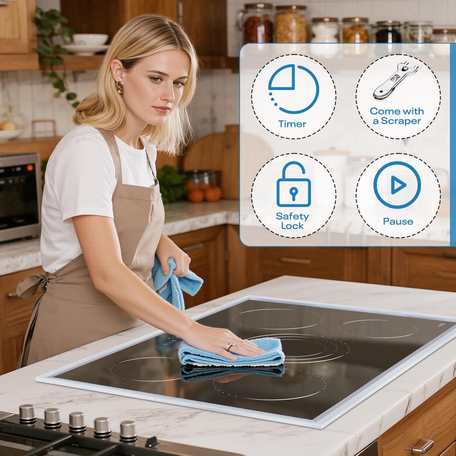 【Safety Timer, Lock & Pause Function】Designed for family safety, this 30 inch electric stove includes a 99-minute timer, child safety lock, and handy pause feature. Set automatic shut-off, prevent accidental changes, or temporarily stop heating without resetting your cooking progress.