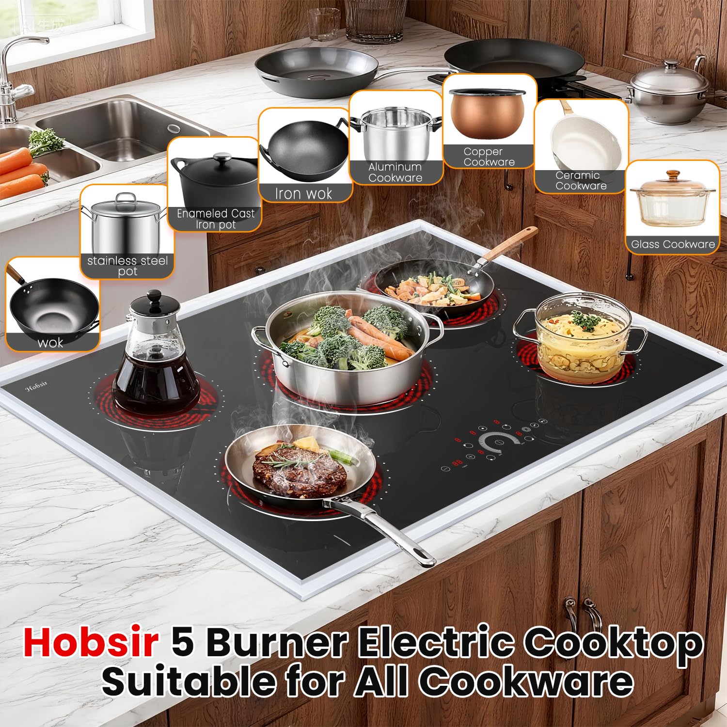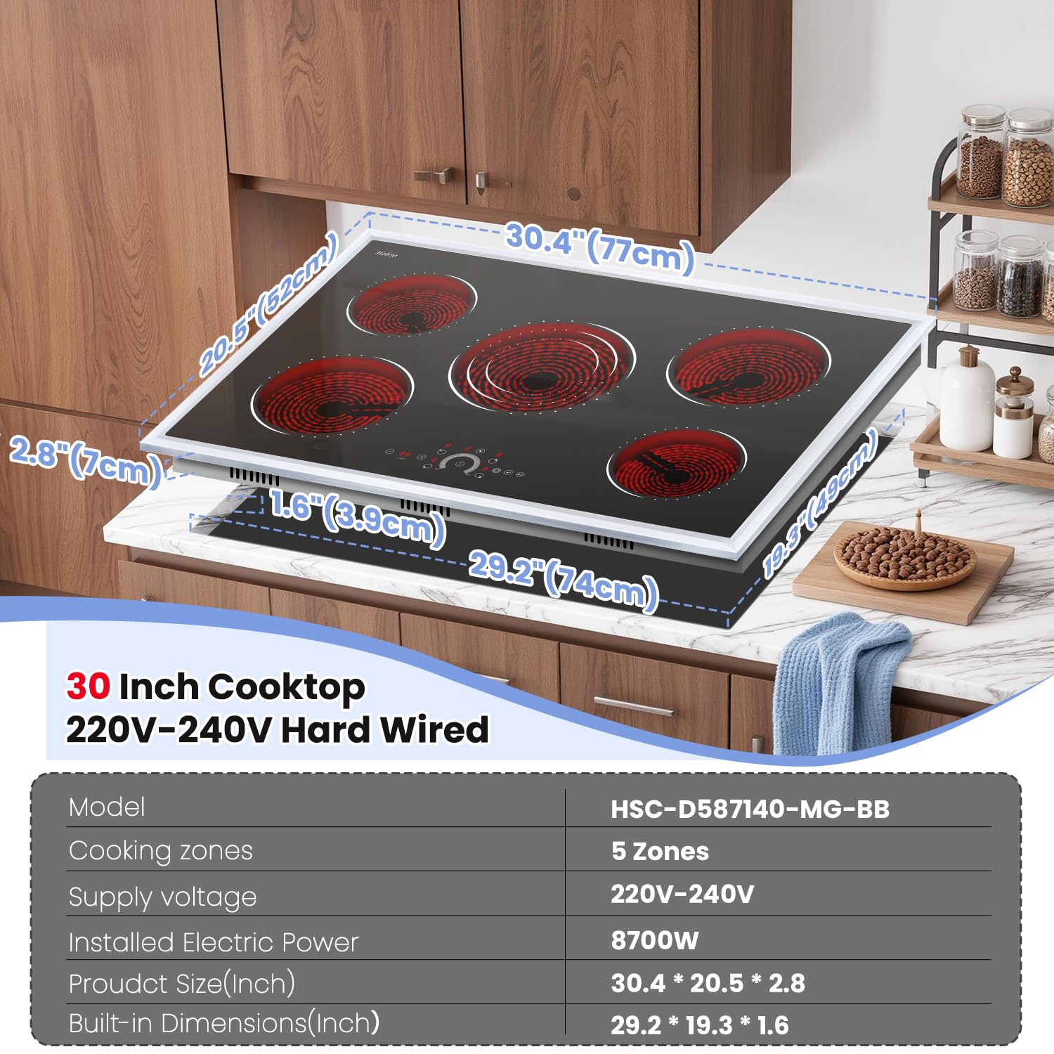 【Built-In Installation & Universal Cookware Compatibility】This built-in electric cooktop 30 inch is designed for seamless built-in installation (requires 29.2" x 19.3" cutout). Compatible with all flat-bottom cookware—stainless steel, cast iron, ceramic, and more—and operates on 220V-240V for powerful and reliable everyday use.