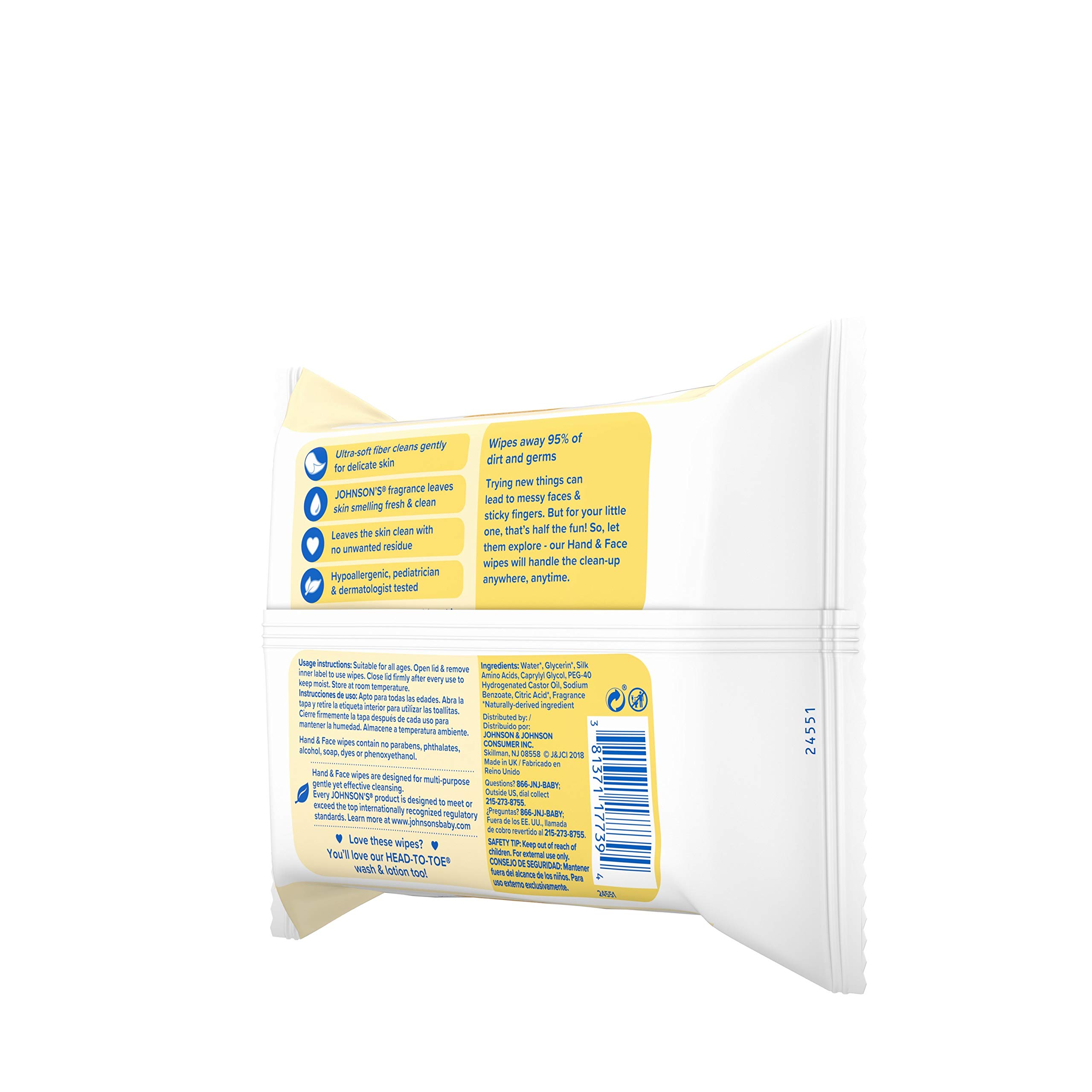 These baby hand cleansing wipes gently remove 95% of dirt and germs on both the face and hands, and contain Johnson's No More Tears formula so they're as gentle to the eyes as pure water