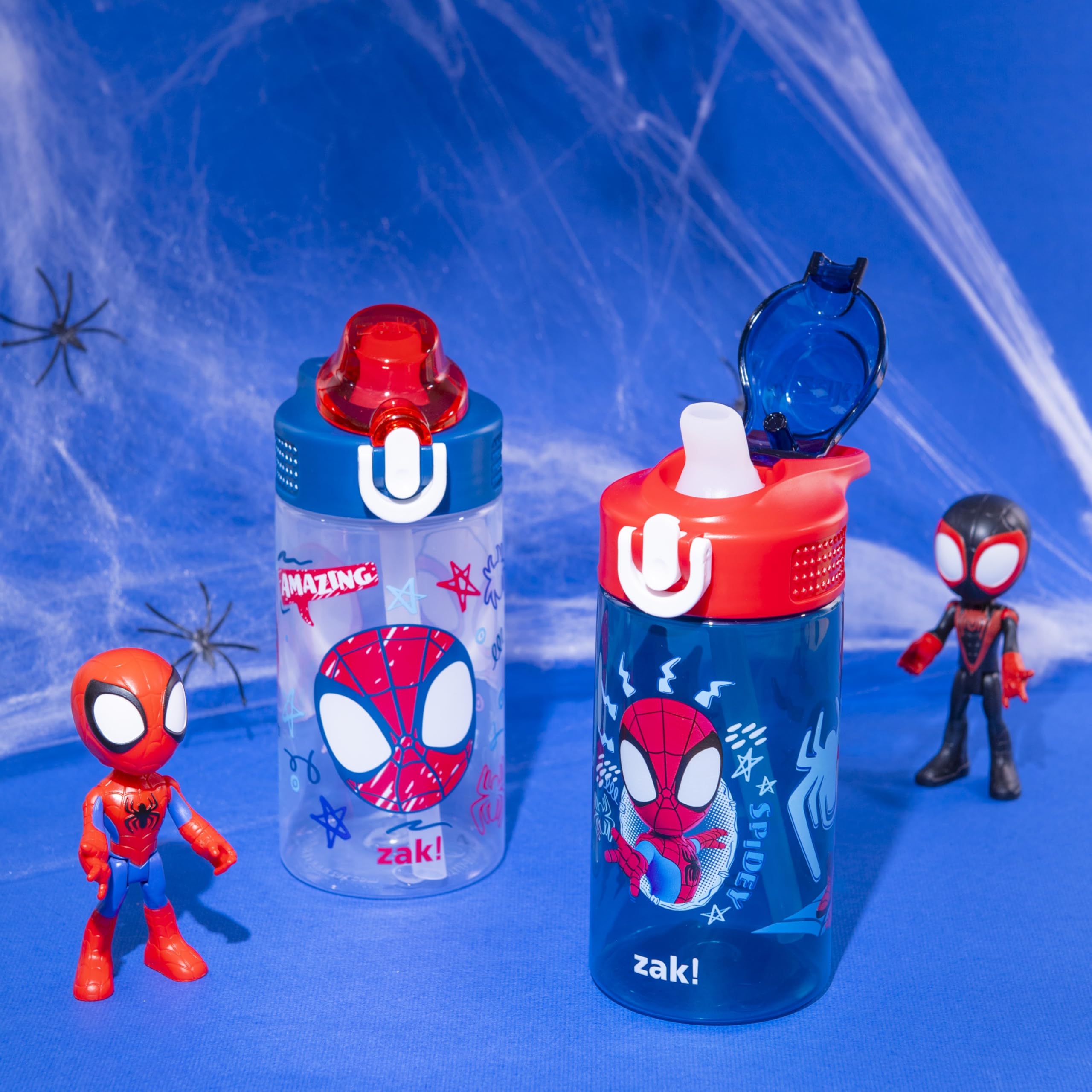 Let kids enjoy hydration with a fun Spider-Man water bottle set by zak! designs! Easy to Clean: The silicone spout and straw can be removed from the lid, and the pieces are dishwasher safe for simple cleanup at the end of the day. Reusable and Durable Material: Reusable water bottles will last wash after wash—good news for you and the environment! The 16 oz water bottles are made of PP plastic, durable enough for kids to use every day and bring on any adventure. Leak-Proof Lid: The lid screws on securely and won't leak when the spout is closed, though water flows for easy drinking when the spout is open. The easy-open button has a flip-up lock to keep it from activating accidentally. On the Go: The water bottle has a built-in carrying loop on the lid for easy transportation, and with the spout cover to keep the spout clean and closed, it can be tossed into a bag for worry-free travel. Specifications: Set of two water bottles with 16 oz capacity. Made of durable plastic. BPA-Free - zak! is committed to safety. Dishwasher safe, do not microwave. Length: 4.33-inch, Width: 2.78-inch, Height: 7-inch. Character: Spidey, Spin, Ghost-Spider (Marvel's Spidey and His Amazing Friends).