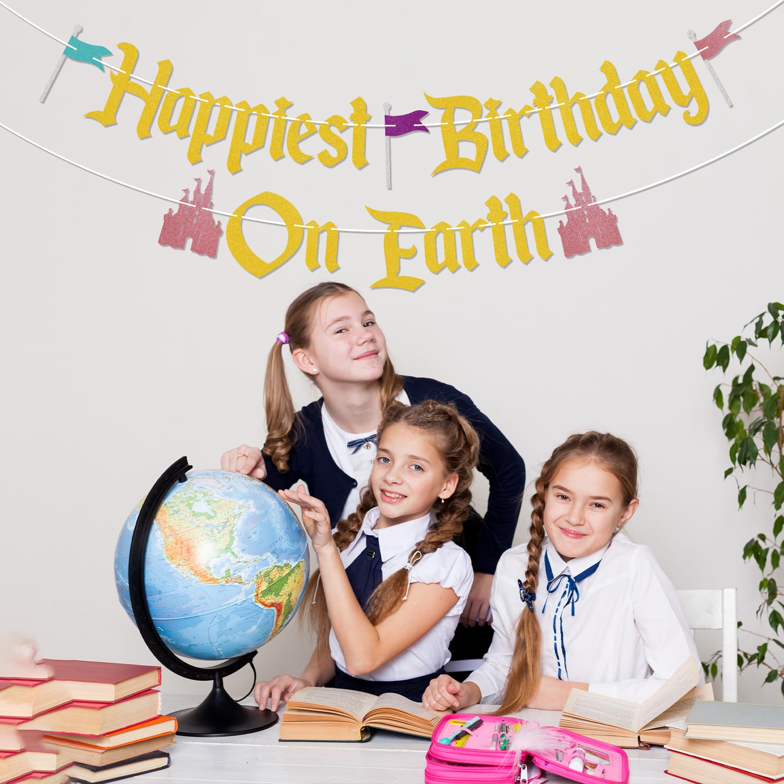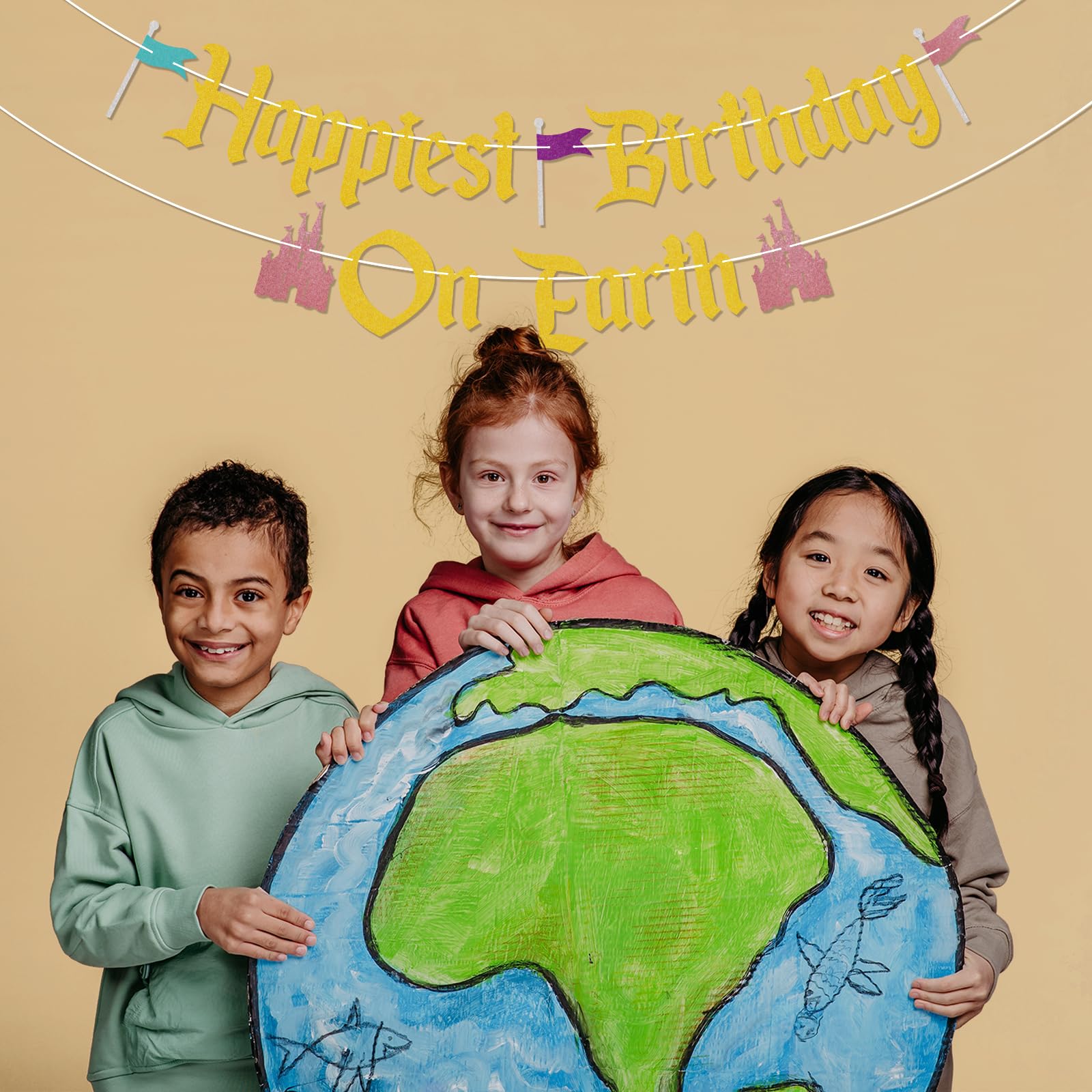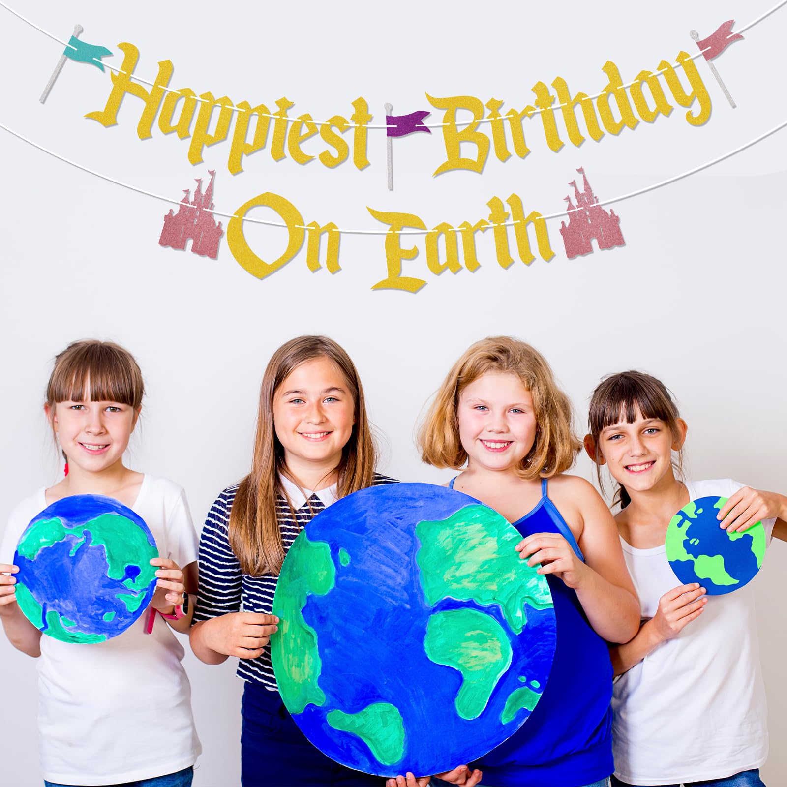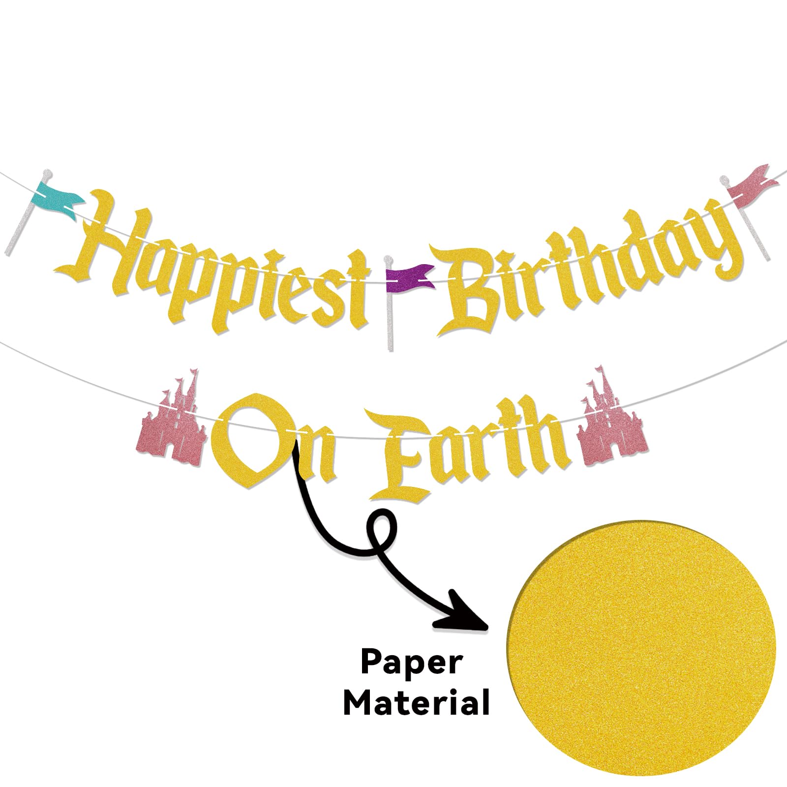 ASSEMBLED - Unlike other banners, the Happiest Birthday On Earth banner you receive is assembled, so you don't need to waste time assembling it, you can use it directly! UNIQUE DESIGN - our banners are made from beautiful glitter paper, ensuring that our Happiest Birthday On Earth banners are of the highest quality and stand out, and will also make your Castle Them Baby Shower/Birthday Party unique, which will be a great addition to your Birthday Party! SPECIAL DESIGN & PREMIUM QUALITY - Thick, high quality cardstock for durability, each letter measures 5''-7'' and is made from 300 gram glitter paper stock. You can use them to decorate walls, mantels, banisters, windows, dessert tables, doorways, or even as a photo backdrop. A BIG HIT - This glittery Happiest Birthday On Earth banner is designed for Princess Theme Birthday Party. It's a way for people to say Happy Birthday.This year, birthday party will be even more cheerful with this Happiest Birthday On Earth banner. PACKAGE INCLUDES - 1 piece of glittery banner that spells out Happiest Birthday On Earth.
