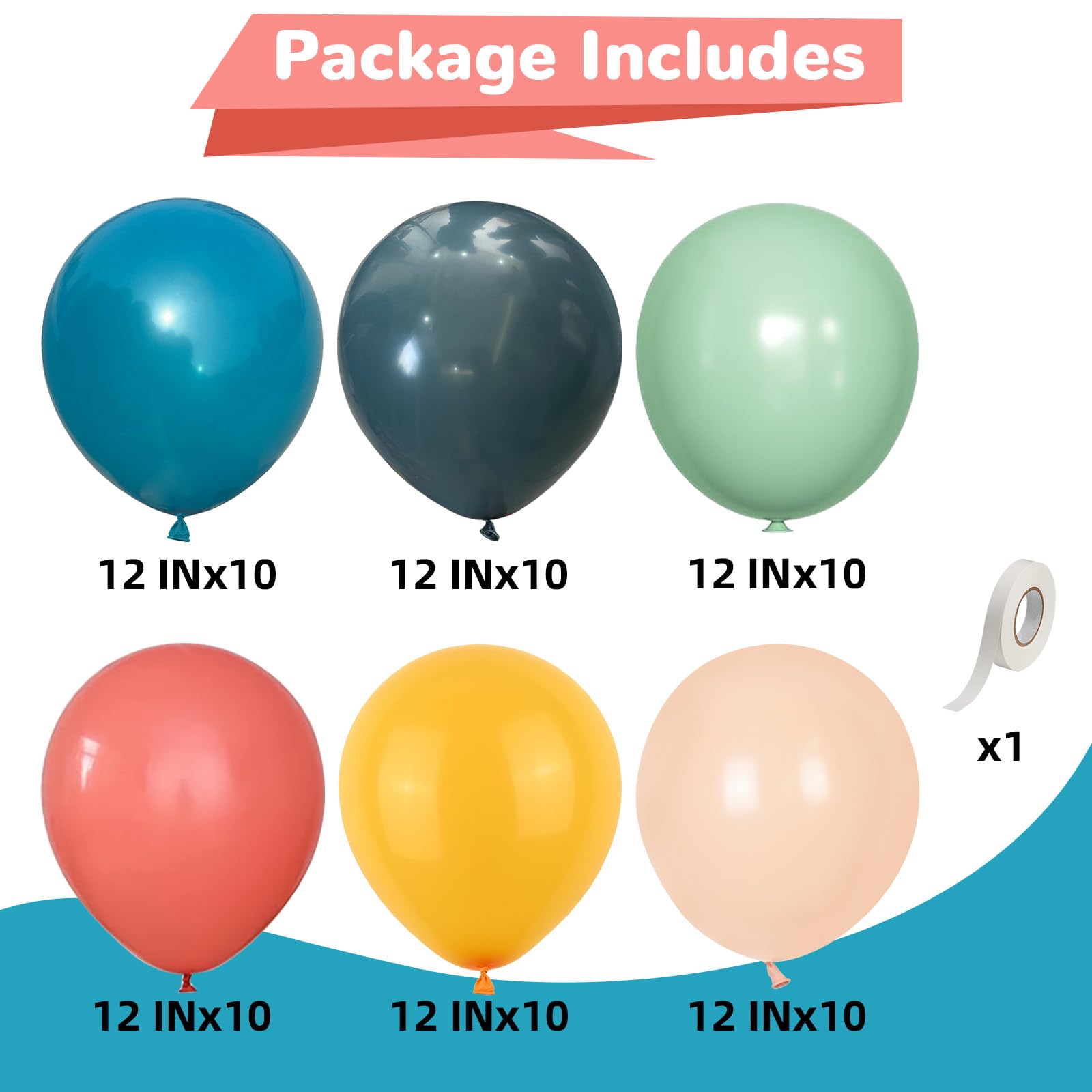 Variety of Colors: Includes 12 inch 10 pcs teal balloons, 12 in 10 pcs slate blue balloons, 12 in 10 pcs olive green balloon, 12 in 10 pcs dark orange helium balloons, 12 in 10 pcs light orange balloons, 12 in 10 pcs lemon yellow balloons and a roll of balloon ribbon