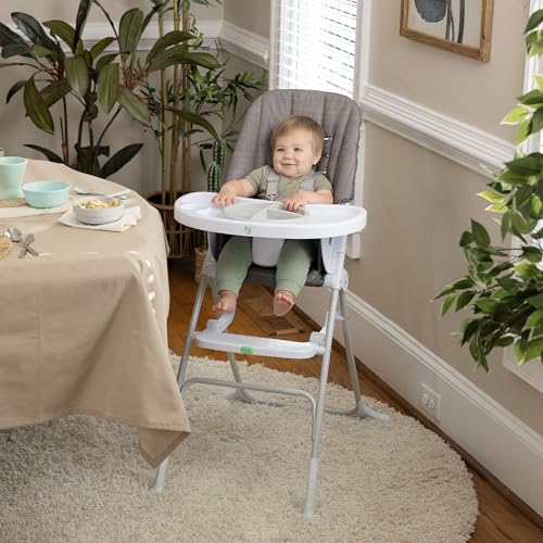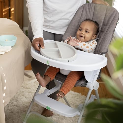 Save space in your home and give baby a superior mealtime experience with the ity by Ingenuity Sun Valley Compact Folding High Chair in Grey. The lightweight, modern high chair features a compact design for easy storage and portability. This slender chair folds flat for storage, stands on its own when folded, and is the only high chair to offer a plate to promote baby's self-feeding skills. The unique 2-section Twist & Dine plate locks securely in place to prevent little ones from tossing it to the floor and is microwave safe for easy meal prep. As baby grows, the large tray adjusts to 3 positions. The tray attaches to the back of the chair when storing. Machine washable seat pad. 5-point harness keeps baby secure. The ity by Ingenuity Sun Valley Compact Folding High Chair is part of the Sun Valley Collection. This baby high chair is for children ages 6 months to 3 years old or up to 33 pounds, whichever comes first. The assembled dimensions are 22.05'' (W) x 29.28'' (D) x 38.78'' (H). Third party safety tested and approved. A great gift for new parents, grandparents, and caregivers with space-saving functionality, yet super-cute baby must-haves!