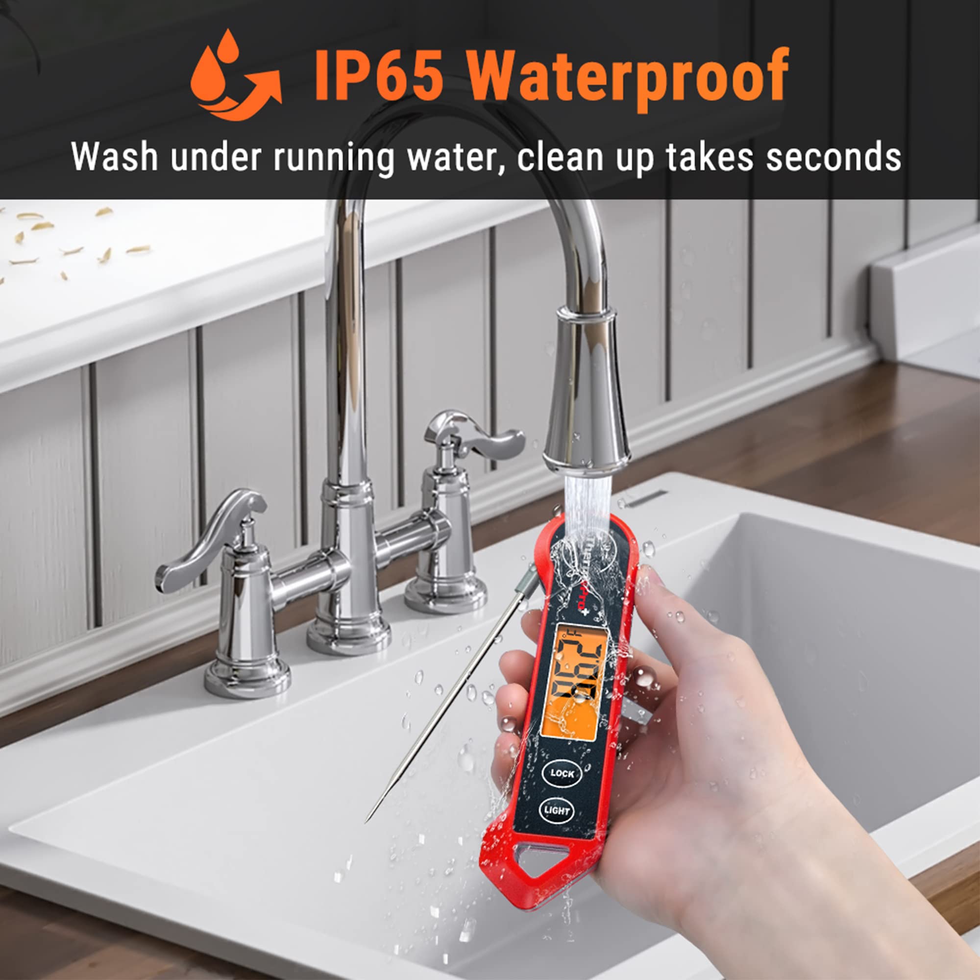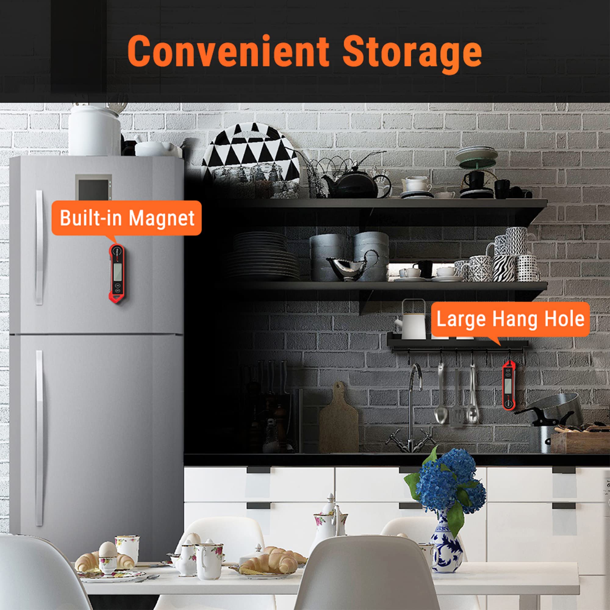 IP65 Waterproof & Convenient Storage: Quickly clean the digital meat thermometer with probe under running water; features a magnetic back to allow for placement on any metal surface or use the hang hole for hooks