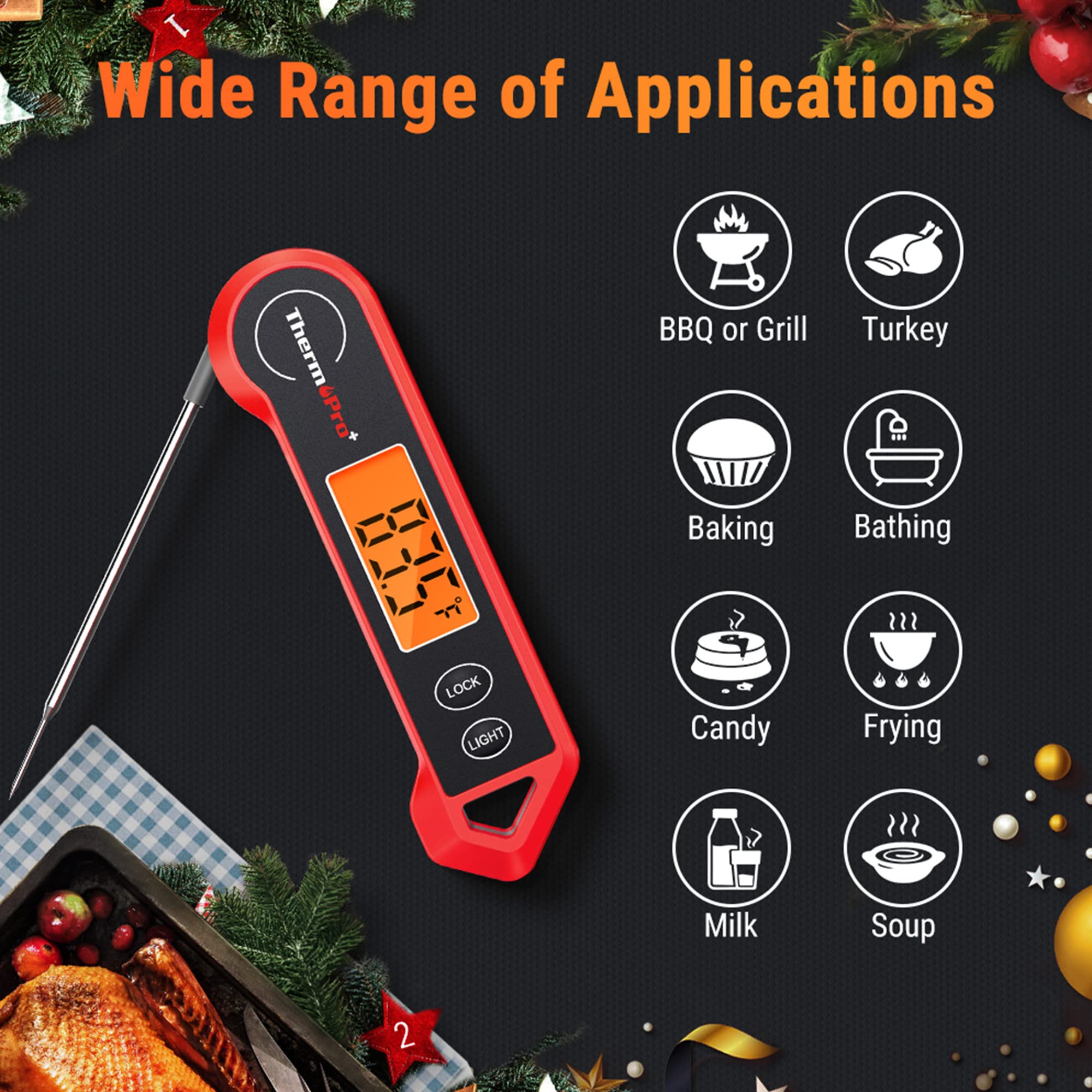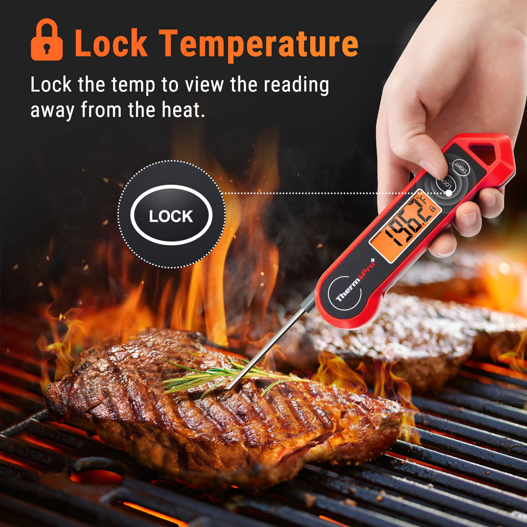 Lock and Calibration: instant read food thermometer features lock function to lock the temperature on the display,so you can read temp away from the heat; Keep your temperature probe always accurate through calibration function