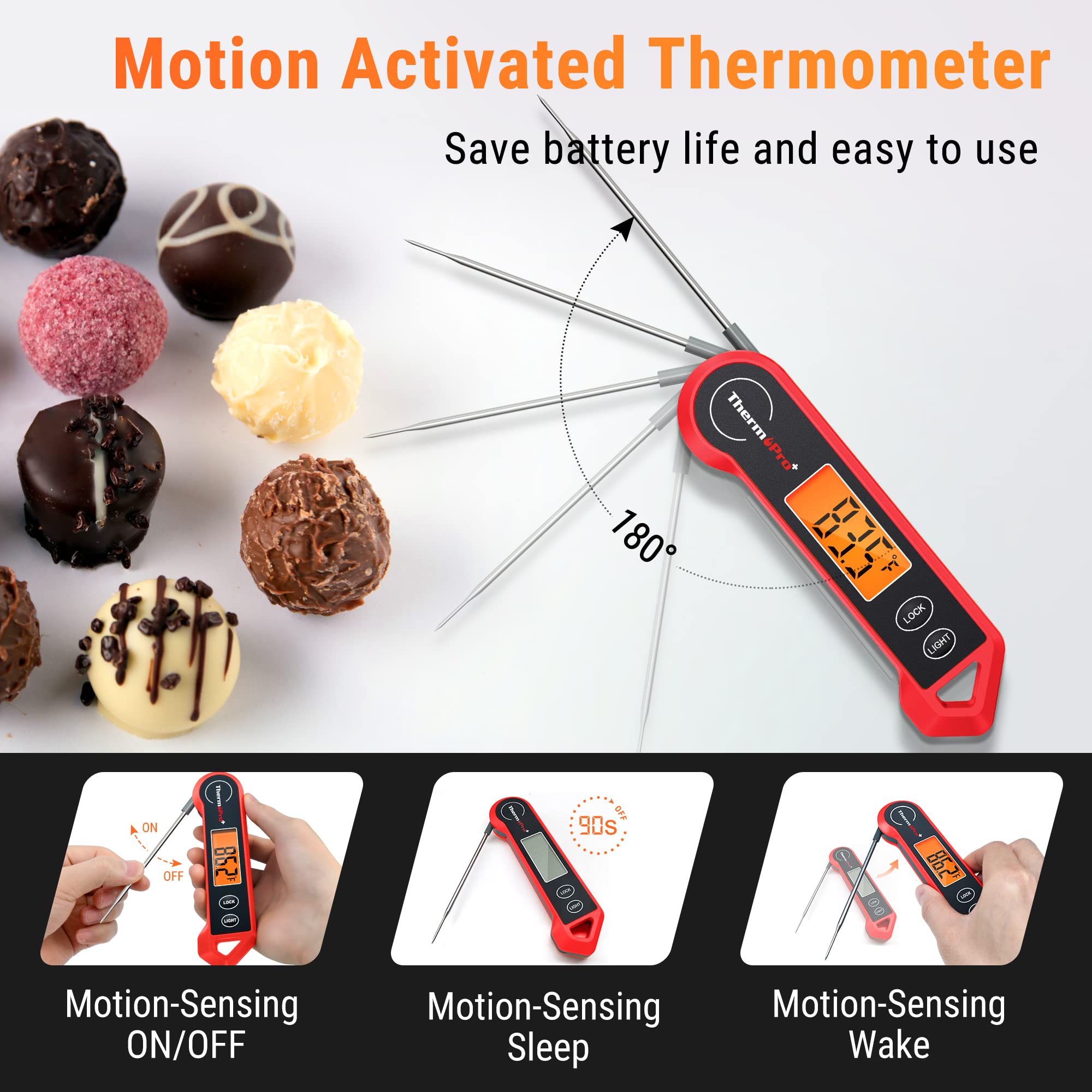 Motion sensing sleep/wake: Directly turns on and off by the probe opens or closes; instantly wakes when picked up the digital food thermometer and sleeps when set down to save battery power; up to 3000 hours with included 3A battery