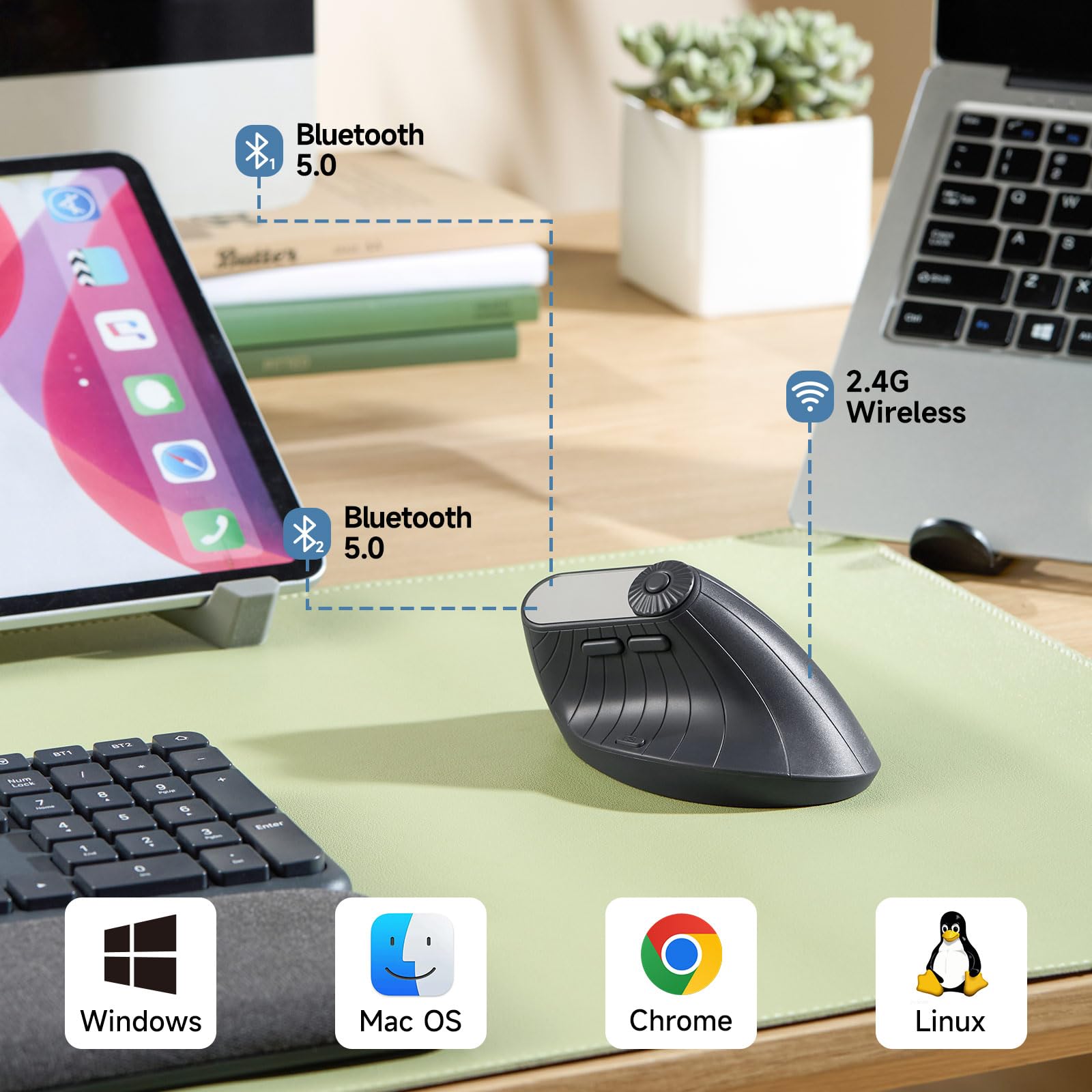 Triple-Mode Connection - Supports 4-way of connection: 2.4G wireless with USB-A receiver, dual Bluetooth 5.0, and a USB-C wired connections(plug and play). SANWA ergonomic bluetooth mice can easily pair and switch between up to three devices like laptops, desktops, and tablets. Note: When connected with wire, this ergo mouse cannot switch between other 3 devices. Only on 2.4G or Bluetooth mode, it can be switched.
