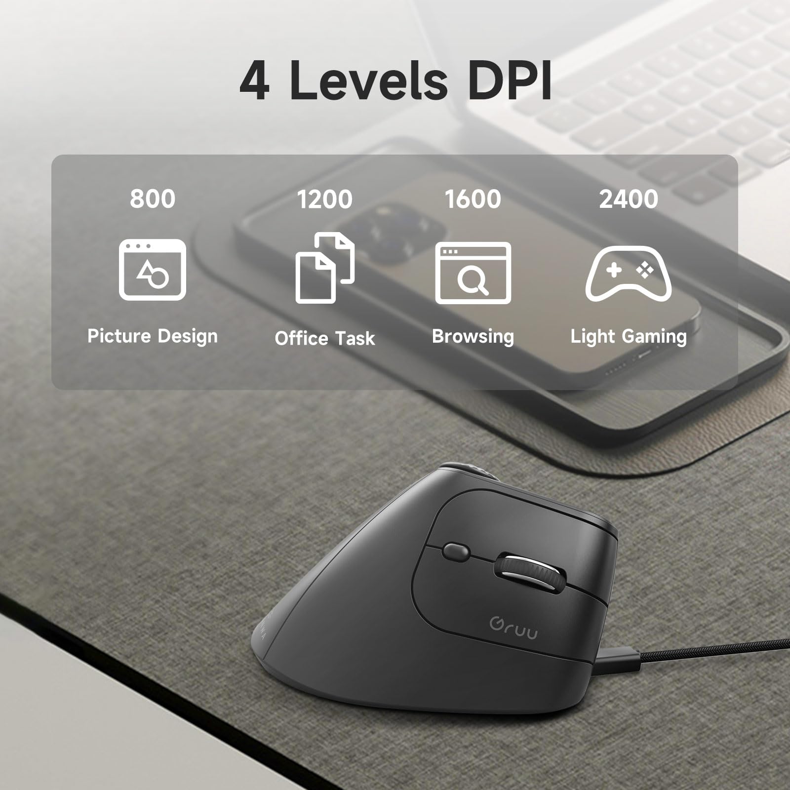 Upgrade Blue LED Sensor & 4 DPI Levels - High-precision blue LED sensor delivers more accurate tracking than traditional red light sensors, even on glossy or uneven surfaces. Enjoy smoother control on desks, mouse pads, or glass. 4 adjustable DPI settings (800/1200/1600/2400) for design work, office tasks, browsing, and light gaming.