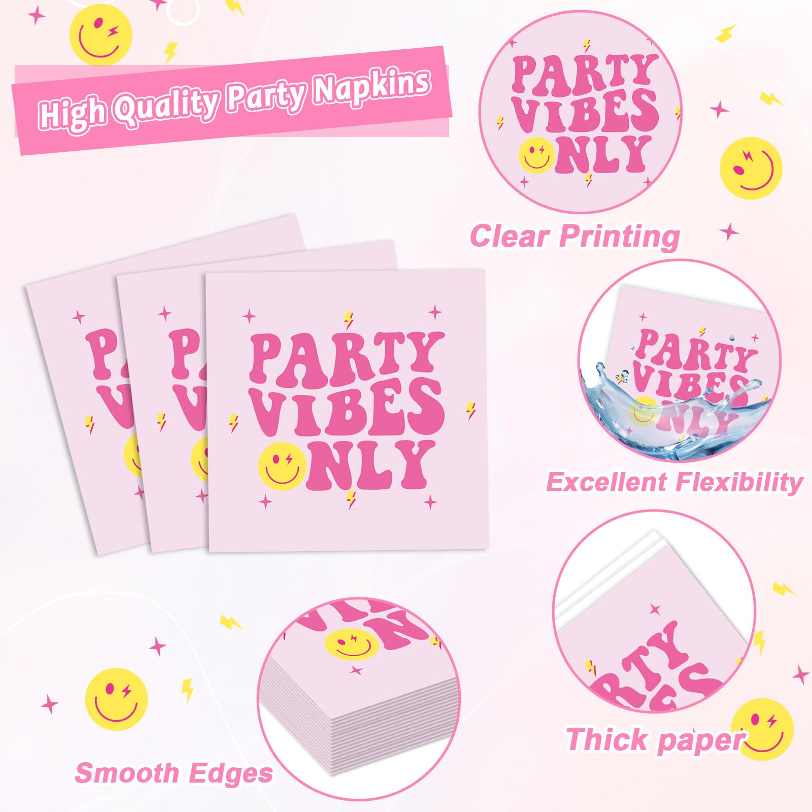 Reliable material: These pink smile face party plates are made from thick, heat-resistant paper, offering sturdy support for a variety of foods.The soft, highly absorbent napkins add both comfort and functionality to your celebration, while the plastic forks are durable and break-resistant.