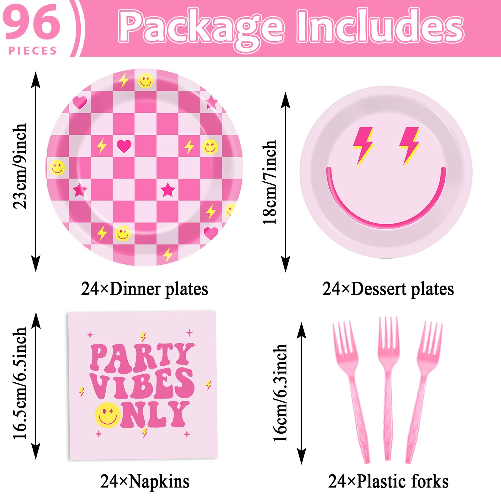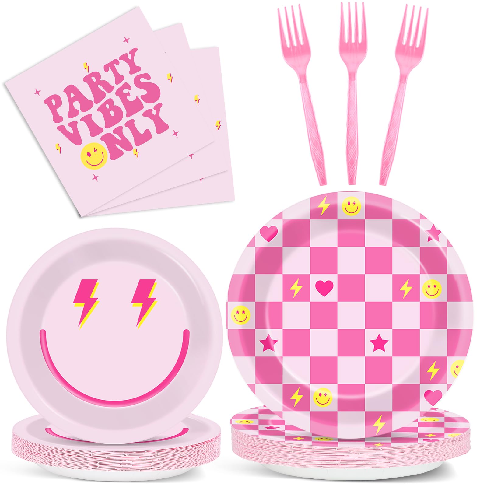 Package content:This preppy party supplies set includes 24 9-inch checkered smile face dinner plates, 24 7-inch preppy smile face dessert plates, 24 6.5-inch napkins, and 24 pink plastic forks, enough to serve 24 guests. This preppy party tableware set will elevate your celebration and impress your guests.