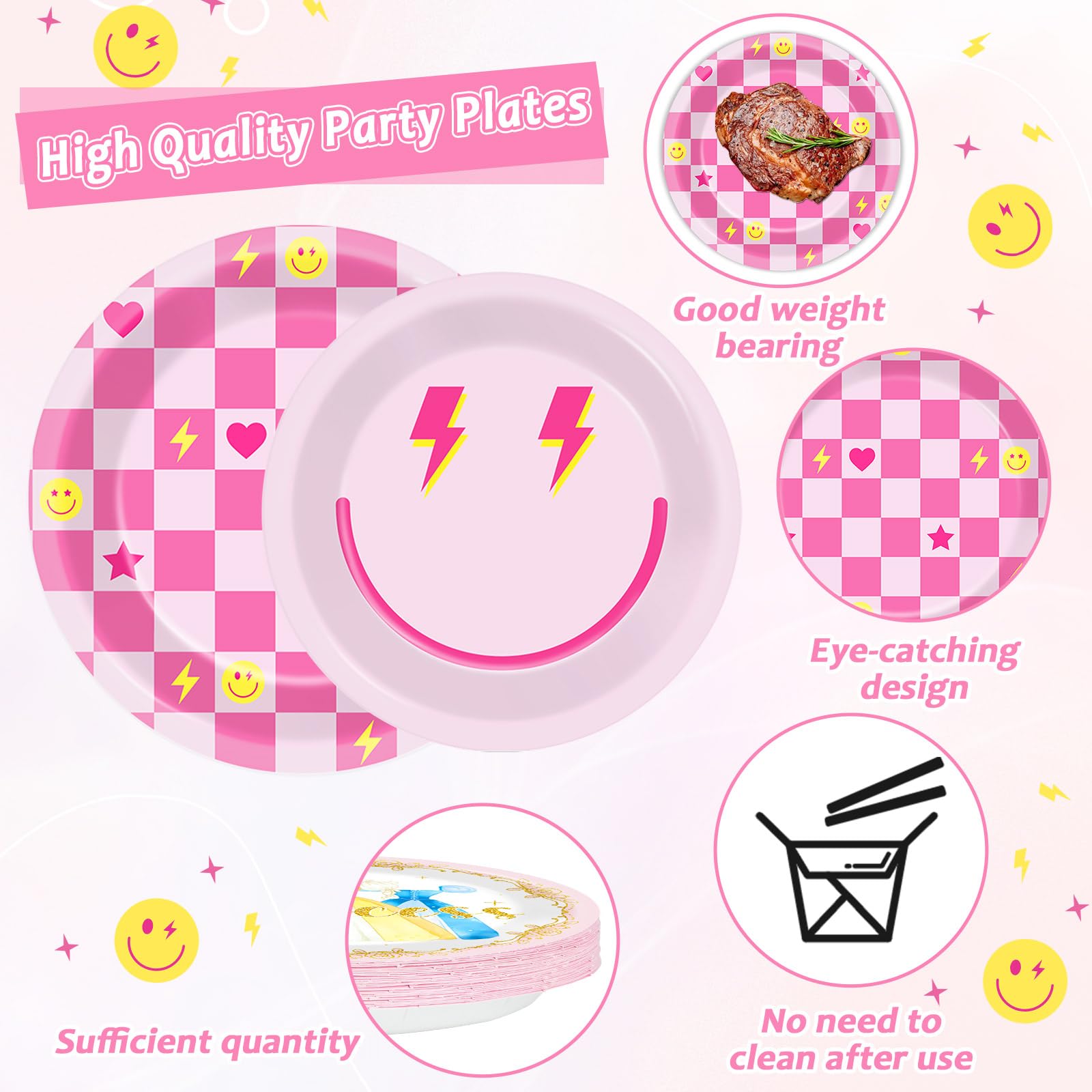 Wide applications:The pink happy face party tableware set adds a charming touch to any occasion, from preppy smile parties and birthdays to baby showers, bridal showers, bachelorette parties, weddings, family gatherings, and beyond, enhancing the overall dining experience.
