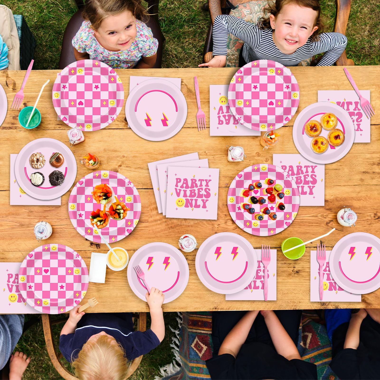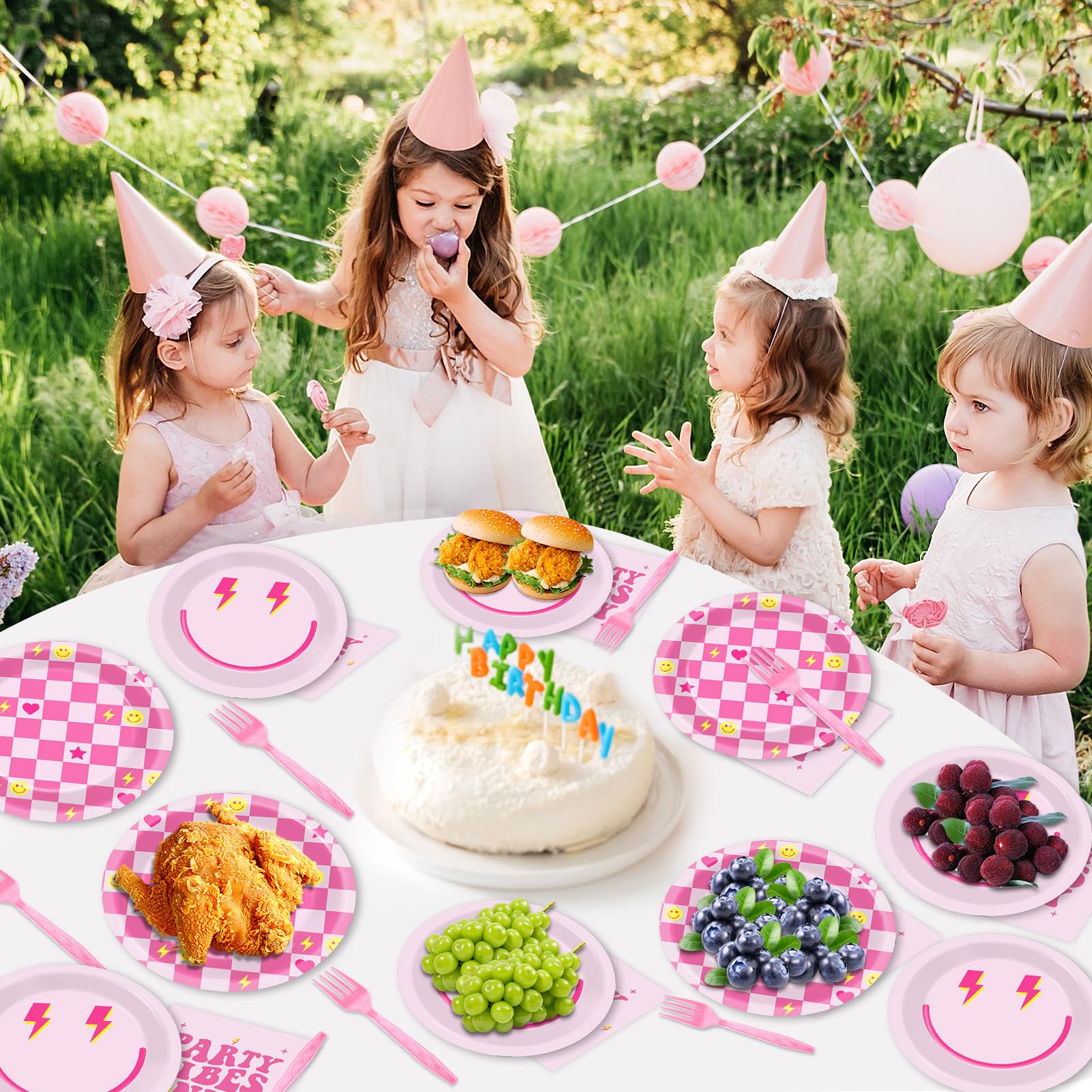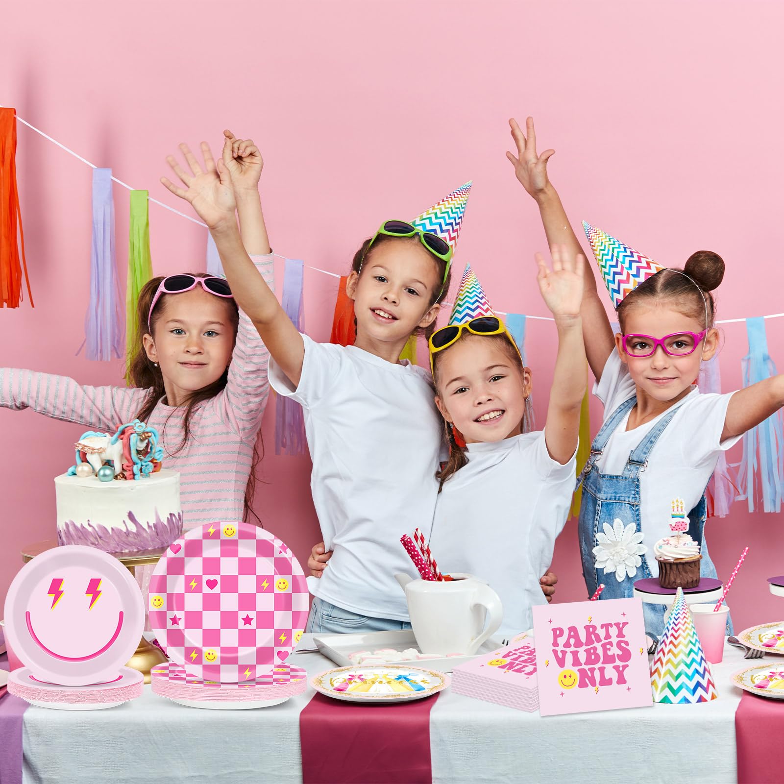 Pink preppy smile face design: This preppy birthday party decorations set features adorable smile faces, plaid patterns, stars, and hearts, all coming together to create a cheerful and inviting party atmosphere. This pink smile face party tableware set is an ideal choice for parties, gatherings, and special occasions.