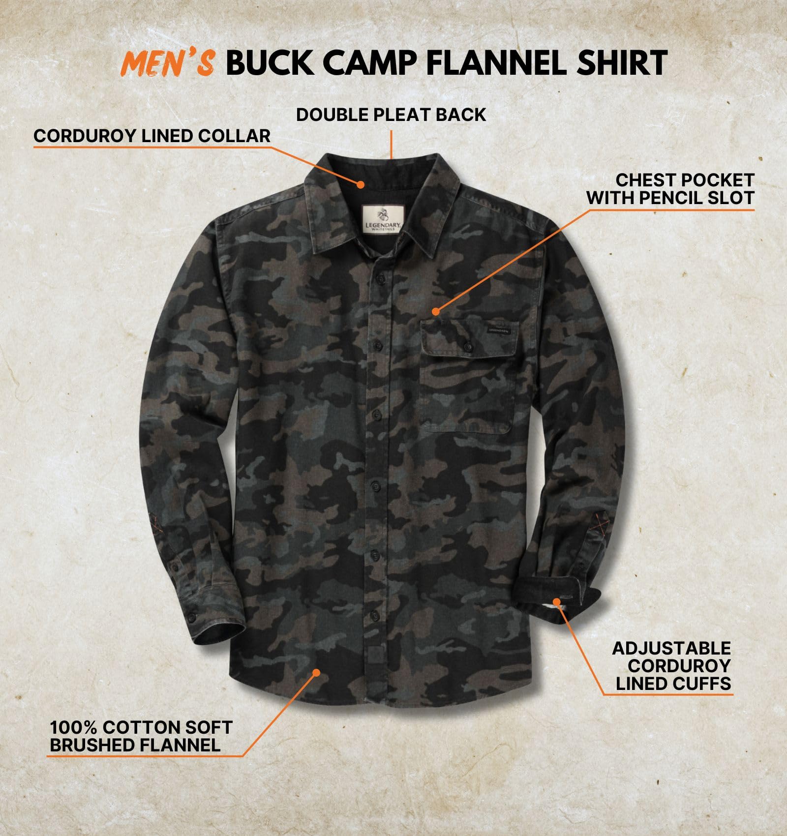 Description Our original single pocket flannel - The Buck Camp Flannel Shirt is the perfect weight to wear alone or layered over a t-shirt or under a shirt jacket. The traditional style and signature corduroy details offer unmatched durability, while the relaxed fit and brushed cotton flannel provide ultimate comfort. With multiple exclusive plaids and solids, they're suitable for any occasion from the woods to the office. The Buck Camp Flannel Shirt gives you an incredible "bang for your buck"! Big & Tall sizes are designed for men over 6'2" and add 2" in body length and 1-1⁄2" in sleeve length.