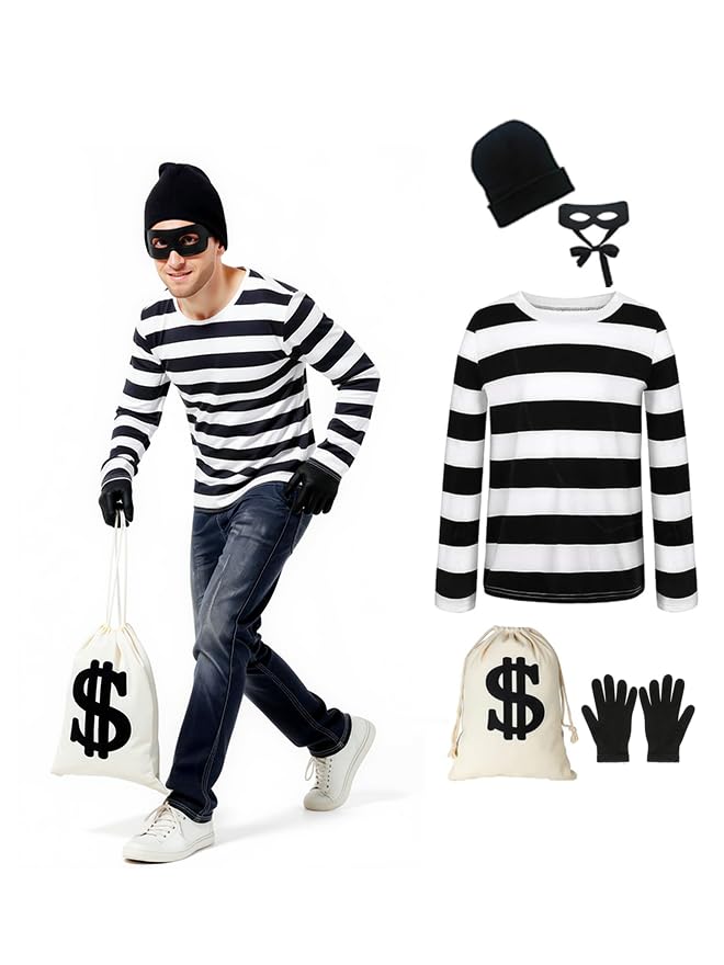Description Make a Striking Entrance This Halloween in Stealth Mode! Highlights: Complete collection of women's thief costumes, perfect for festive occasions Crafted from premium materials for lasting comfort Available in multiple sizes to accommodate various body types A timeless design that appeals to a diverse audience Details: Color: As depicted in the images Includes: 1 Long-sleeve striped T-shirt 1 Pair of black gloves 1 Black knitted hat 1 Money bag with dollar sign 1 Black eye patch 1 Pair of knee-length socks Important Note: Please confirm your size prior to purchase.