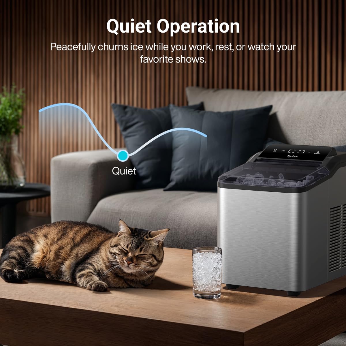 COMPACT & QUIET COUNTERTOP DESIGN: With a portable 12.09W × 8.98D × 12.36H inches footprint, this nugget ice machine fits apartments, RVs, and small kitchens. Operating at a quiet 50 dB, it keeps your drinks chilled without crowding your precious space