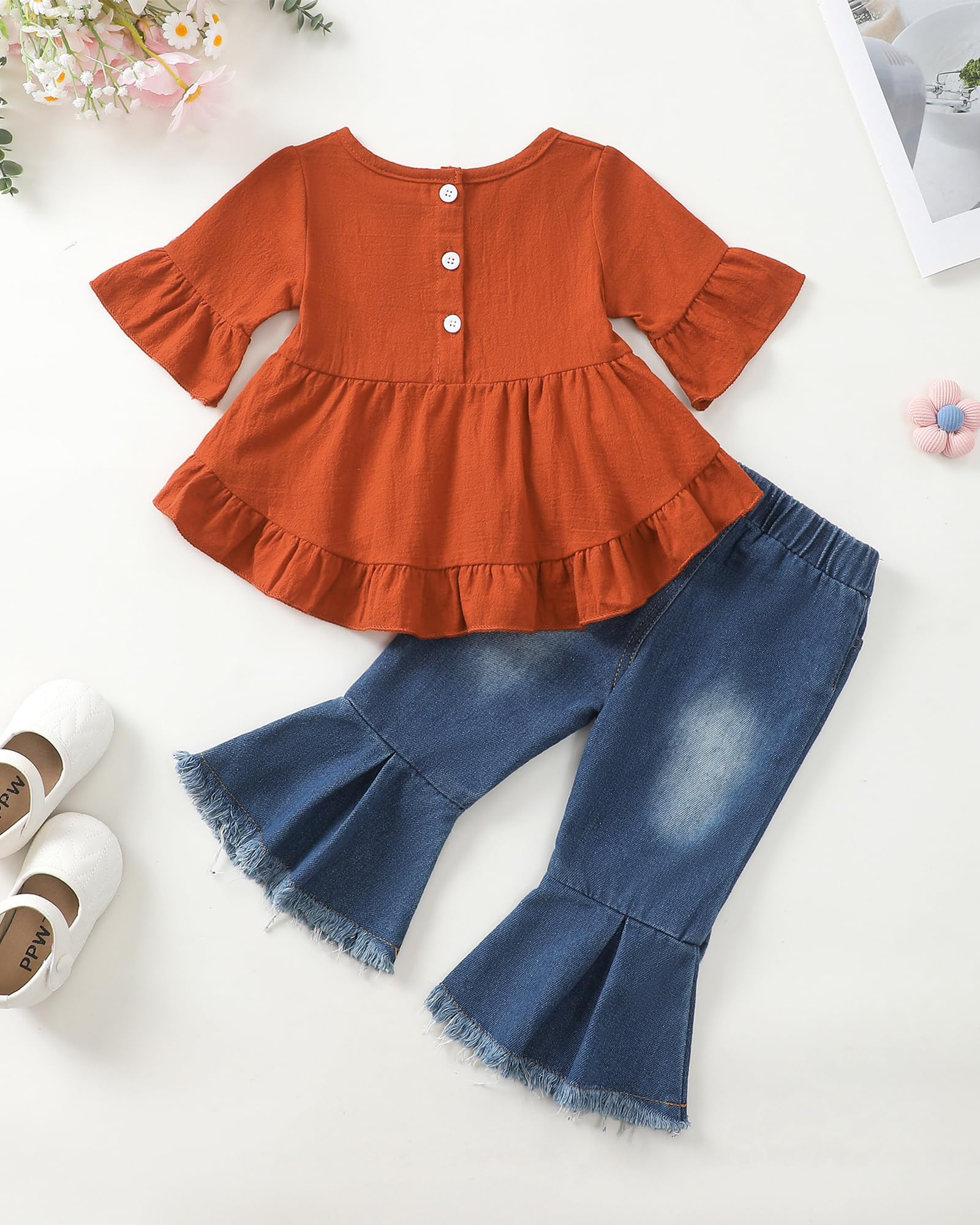 Cute and Trendy: This two pieces girls outfit includes a ruffle top with a hi-lo hem design,buttons closure and 1/2 ruffle sleeves we love,and pull on denim jeans with elastic waist and bell bottom. A top choice for little girl summer fall clothes,that's sure to get compliments.