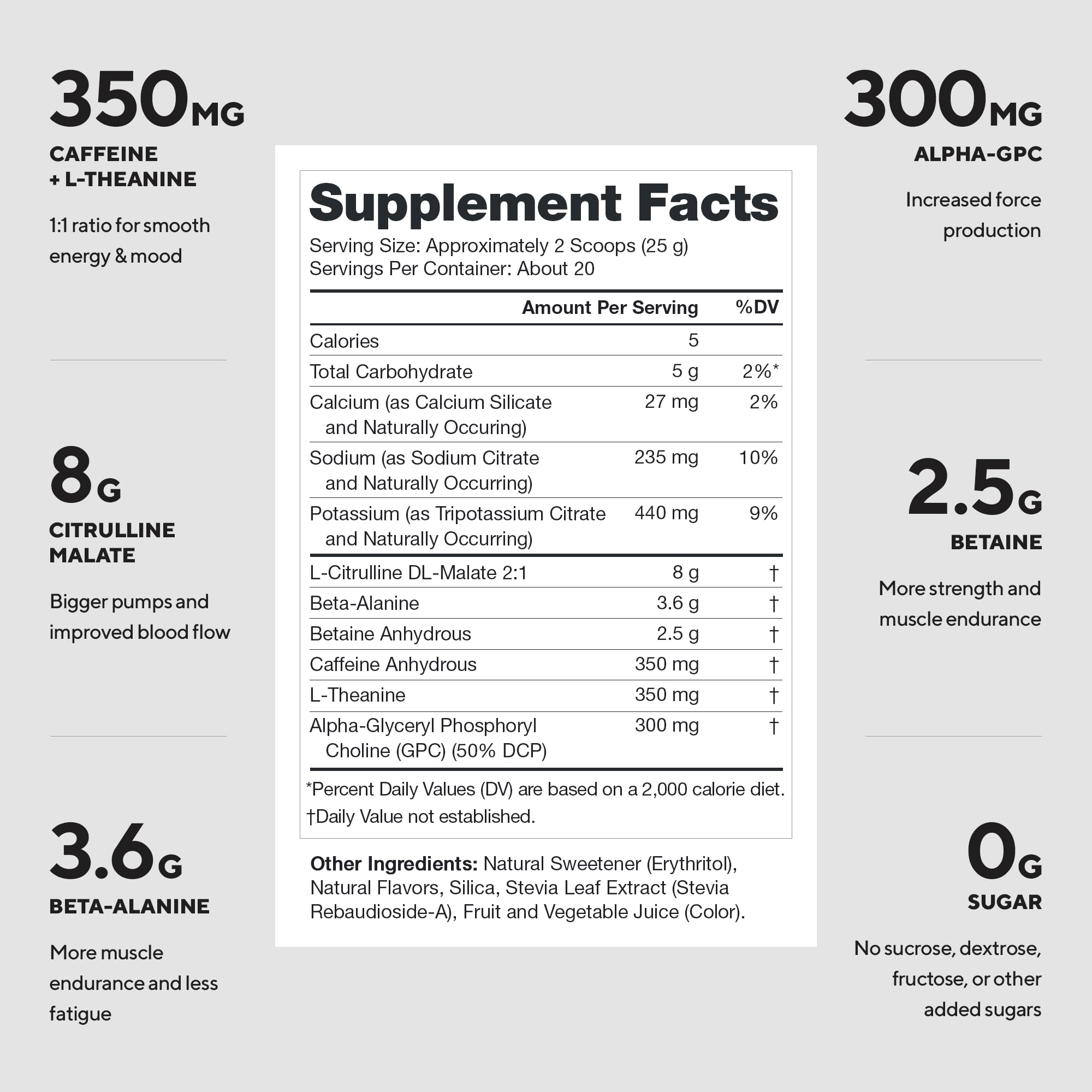 Clean pre workout and transparent label that shows exactly what’s in every serving of our preworkout for men and women and what’s not (no proprietary blends or hidden ingredients).